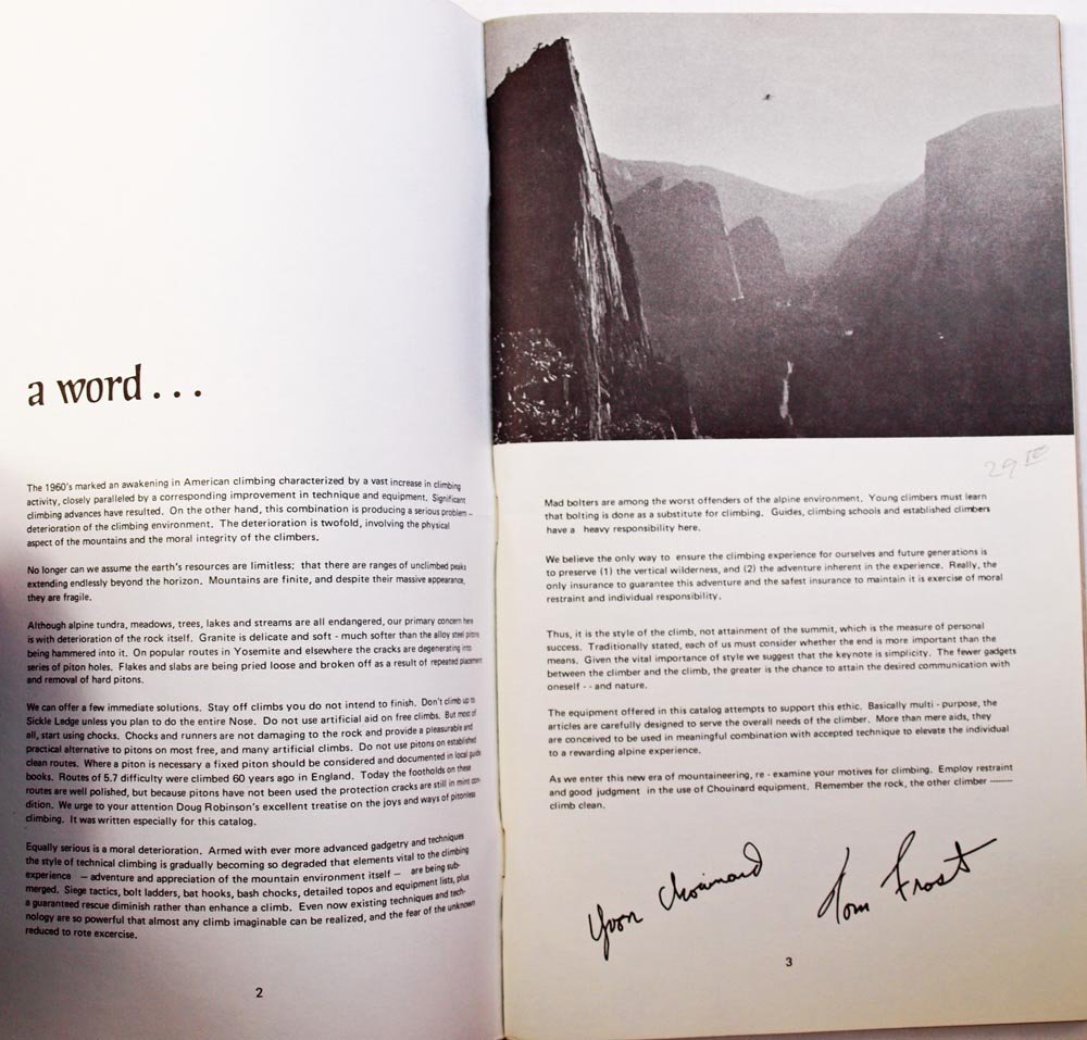 A catalog from the mountain climbing equipment company Chouinard. Along with the equipment is information about rock and mountain climbing and the use of the equipment.