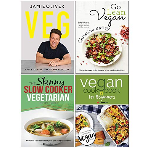 Please Note That The Following Individual Books As Per Original ISBN and Cover Image In this Listing shall be Dispatched Collectively: Veg Jamie Oliver [Hardcover], Go Lean Vegan, Skinny Slow Cooker Vegetarian Recipe Book, Vegan Cookbook For Beginners 4 Books Collection Set: Veg: Easy & Delicious Meals for Everyone: From simple suppers and family favourites, to weekend dishes for sharing with friends, this book is packed full of phenomenal food - pure and simple.Whether it's embracing a meat-free day or two each week, living a vegetarian lifestyle, or just wanting to try some brilliant new flavour combinations, this book ticks all the boxes. Go Lean Vegan: This revolutionary step-by-step 30-day diet plan will help you lose weight and start feeling better fast - while eating delicious, satisfying plant-based foods (and absolutely no calorie counting).Carefully developed by award-winning nutritionist and chef Christine Bailey, including nutritionally balanced, gluten-free and delicious recipes, this easy-to-follow, protein-rich vegan weight-loss programme will get the results you want and keep you healthy and energised. The Skinny Slow Cooker Vegetarian Recipe Book: Whether you are a vegetarian or just love vegetables, this collection of easy to prepare and delicious low-calorie vegetarian recipes will help you make inexpensive, healthy, meat free meals for you and your family with the minimum of fuss.The recipes are simple and easy to follow with fresh and seasonal ingredients and are packed full of flavour and goodness. Vegan Cookbook For Beginners: The principles behind veganism encompass the whole planet, from the harmful gasses produced by animal waste, to the belief that we could easily grow enough food to feed the entire world if we didn't have to spend so much of it feeding animals for us to consume.