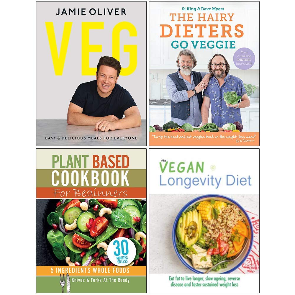 4 Books Collection Set: Veg by Jamie Oliver, The Hairy Dieters Go Veggie, Plant Based Cookbook For Beginners, & The Vegan Longevity Diet