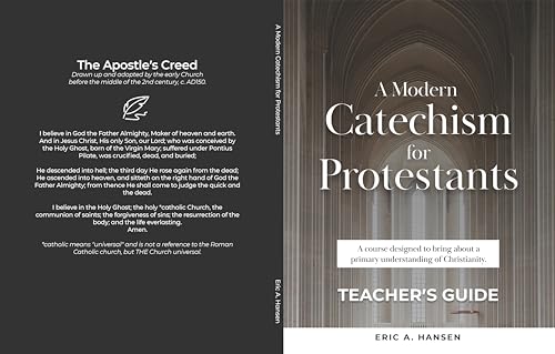 TEACHER'S This full-sized workbook contains ALL THE ANSWERS to the fill-in-the-blanks found in the Student Workbook.The Modern Catechism for Protestants is a fantastic tool for learning and teaching the basic principles of the Christian faith. I can be used in personal study, group studies, youth groups, Sunday School and even homeschool.This book brings complex ideas to an understandable level. Anytime you need to learn or teach the basics of Christianity, this will be your go-to book. From the 10 Commandments to the Lord's Prayer, and everything in between, including the Apostles Creed, this book will remain in your library for years to come.The term catechism is the word used for this style of book; where there are questions and then answers on the topic of Christianity.Every believer, home, and church should have a copy to help teach these timeless Biblical foundations.But in your hearts revere Christ as Lord, Always be prepared to give an answer to everyone who asks you to give a reason for the hope that you have. But do this with gentleness and respect." 1st Peter 3:15