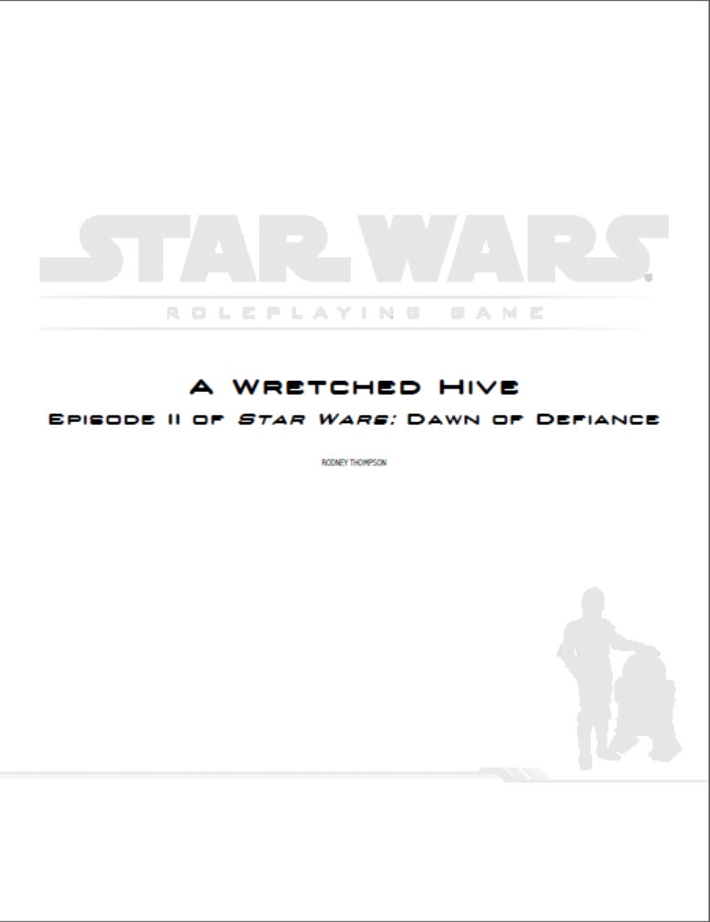 A Wretched Hive is the second adventure in the Dawn of Defiance campaign, which will take heroes from 1st level all the way through 20th level in a continuous storyline designed to give both players and Gamemasters a complete Star Wars Roleplaying Game Saga Edition experience. This adventure lets the heroes delve deeper into the mysterious plot surrounding former Imperial Admiral Varth, and the heroes should advance to 5th level by the conclusion of the adventure. Over the course of this adventure, the heroes get to see what the galaxy is like in the wake of the rise of the Empire, and they discover a bit more about the Empire’s secret plans and how they involve a Hutt crime lord named Darga.