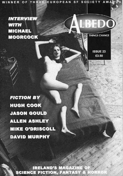 1 • Editorial (Albedo One #23, 2001) • essay by uncredited2 • That Obscure Object of Desire • short story by Mike O'Driscoll8 • Another Sunny Day in Texas • interview of Michael Moorcock • interview by John Kenny15 • Drowning in the Desert • short story by David Murphy18 • On a Planet Similar to Ours, the Virgin Mary Says No • short story by John W. Sexton19 • The Gun • short story by Nicola Caines25 • Famous Monsters (Albedo One #23, 2001) • essay by Underview29 • Hunting Andrew • short story by Hugh Cook34 • Ugly Chickens (Albedo One #23, 2001) • essay by The Readers36 • Echoes from the Phantom Zone (Albedo One #23, 2001) • essay by Severian37 • Millennium TV Guide • short story by Allen Ashley and Jason Gould