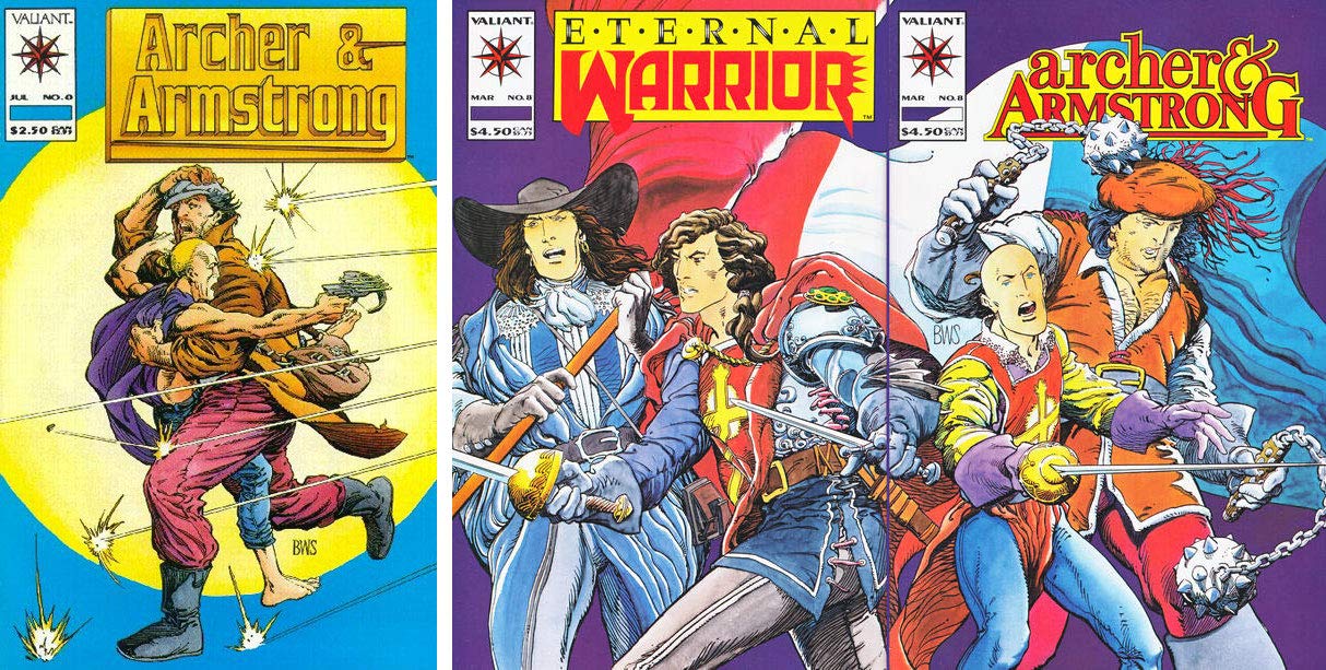 TWO BOOKS IN TOTAL. Cover by Barry Windsor-Smith. "Revival Lifelines" Part 1, script by Jim Shooter (co-plot, script) and Bob Layton (co-plot), pencils by Barry Windsor-Smith, inks by Barry Windsor-Smith (pages 1-13) and Ralph Reese (pages 14-25); Murdered by his sadistic parents, Obadiah Archer returns from the dead with uncanny physical abilities and a to punish all evil-doers like his parents; Learning martial arts in the Orient, Archer soon becomes the world's greatest fighter!; He soon encounters Armstrong, a free-spirited immortal with the strength of ten men!; They have just met when they are attacked by Armstrong's foes, the Sect.; Can they survive their crazy friendship? 36 pgs., full color. Cover price $2.50. ––– Wraparound cover art by Barry Windsor-Smith. "The Musketeers!", script by Barry Windsor-Smith, Jon Hartz (idea), and Alexandre Dumas (based on his work), pencils by Barry Windsor-Smith, inks by Bob Wiacek; This double-sized epic actually combines Eternal Warrior #8 and Archer and Armstrong #8 into one unforgettable tale; It is the story of how immortal brothers, Gilad, Aram, and Ivar, were the original Three Musketeers; In fulfilling his duty as the Fist and Steel of the Geomancers, Gilad dupes his brothers into helping the cause; But, when they realize the truth, Aram and Ivar part ways with Gilad, who places duty over brotherhood; Archer; Armstrong; D'Artagnan [Archer look-alike]; Duchess Angelique D'Terre (geomancer); Eternal Warrior; Ilysee; Ivar; King Louis XIV of France; his twin brother Henri. pin-ups by Tom Mandrake, Paul Gulacy, Rags Morales & Bob Layton, Alan Weiss, Andrew Wendel & Bob Layton, and Jan Duursema. 52 pgs., full color. Cover price $4.50.