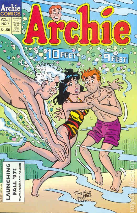 Archie Vol. 1 No. 7. Cover pencils by Stan Goldberg, inks by Henry Scarpelli. "Slip Sliding Summer Fun!", script by Mike Pellowski, pencils by Stan Goldberg, inks by Henry Scarpelli; Betty and Veronica come to save Archie from the summer heat by spending the day at the local ice skating rink. "Disguise The Limit," script by Frank Doyle, pencils by Stan Goldberg, inks by Henry Scarpelli; Archie and Jughead don disguises to spy on Veronica, who's been hanging out at a new beach away from the gang. "Caddy Shock," script by Mike Pellowski, pencils by Stan Goldberg, inks by Henry Scarpelli; Mr. Lodge gets Archie as a caddy at a golf course and has the best game of golf in his life.
