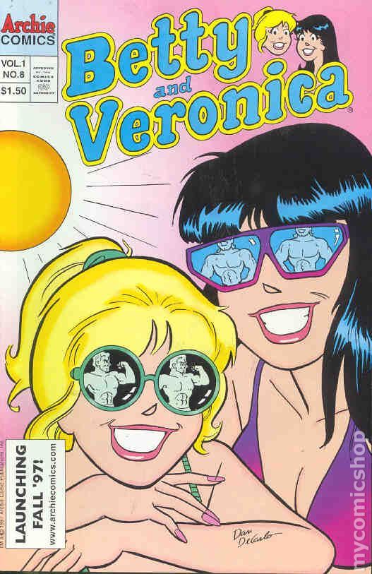 Betty and Veronica Vol. 1 No. 8. Cover by Dan DeCarlo. "Achievement," script by Frank Doyle, pencils by Dan DeCarlo, inks by Henry Scarpelli; Betty is depressed because she's wasted her entire summer; But Veronica helps her count her successes over the past summer. "Little Darling," script by Kathleen Webb pencils by Dan DeCarlo, inks by Henry Scarpelli; Veronica and Betty spend the day babysitting Betty's rambunctious cousins instead of mall shopping. "Dune Disaster," script by Frank Doyle, pencils by Dan DeCarlo, inks by Henry Scarpelli; The girls stage a sand sculpting contest between Archie and Reggie, each having to sculpt his favorite subject. Ye Ol' Swimmin' Hole! pinup by Rex W. Lindsey.