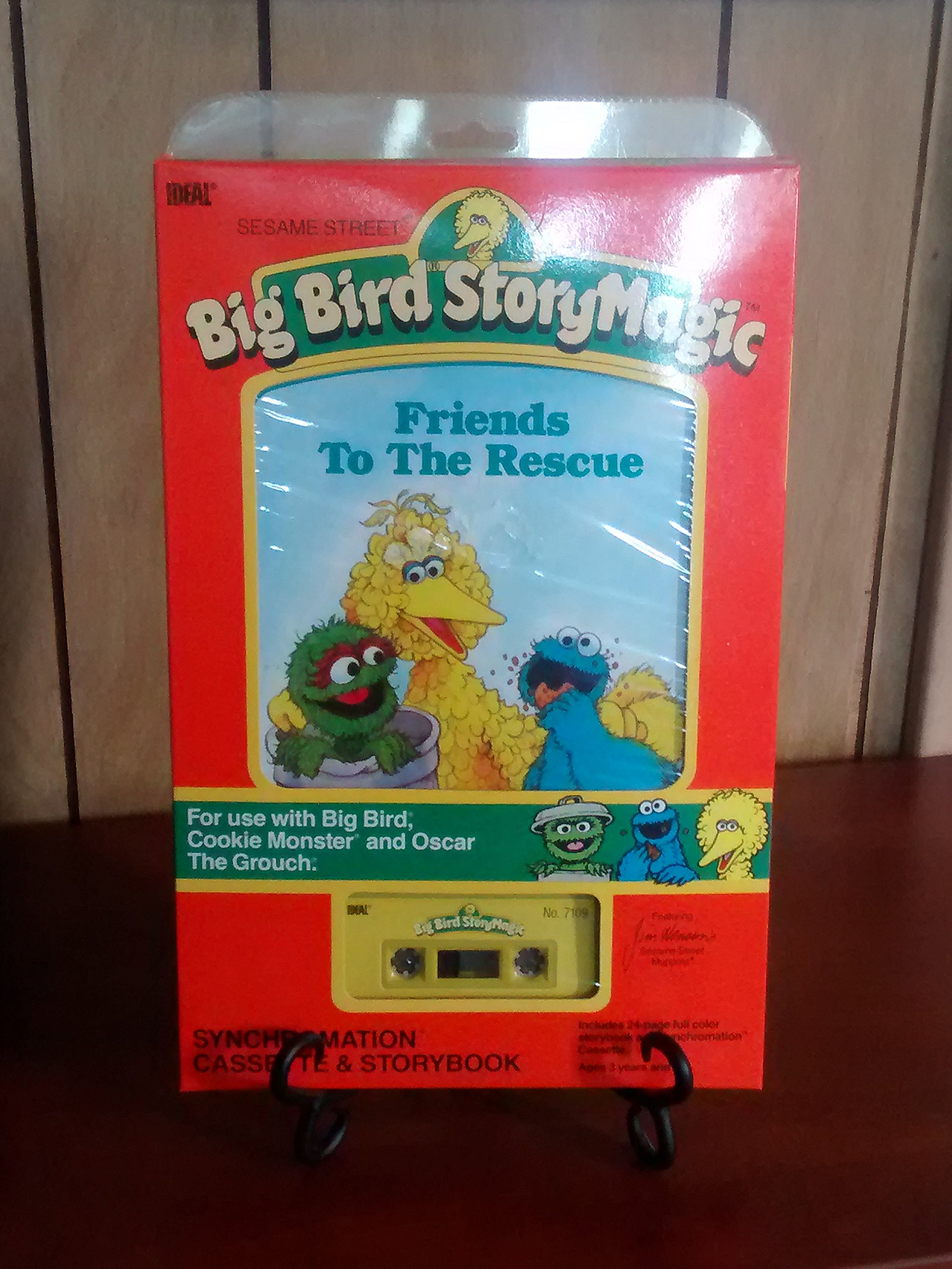 Friends to the Rescue is a 1987 SESAME STREET storybook published by Ideal Toys for the "BIG BIRD StoryMagic" toy set. GRANNY BIRD, in the story, invites BIG BIRD & his friends to the Ladies Club Bizaer, where there will be a rummage sale, refreshments & a pie eating contest. BIG BIRD intends to invite nice, well-behaved Grover & Betty Lou, but neither of them can go. Cookie Monster & OSCAR THE GROUCH invite themselves, & BIG BIRD is very worried about how they will behave. Despite a few bumps along the way, it turns out well in the end. Cookie Monster wins the pie eating contest for the Ladies' Club. OSCAR & his GROUCH friends bring in their rejected TRASH, which isn't broken or ROTTEN enough for them, to the rummage sale, & they even clean up at the end, keeping all of the true TRASH. The tape includes "You Just Need Friends" & "Never a Dull Moment" by Dave Conner. CAROLL SPINNEY recorded the voices of BIG BIRD & OSCAR THE GROUCH, & FRANK OZ the voice of Cookie Monster, for the accompanying cassette tape.