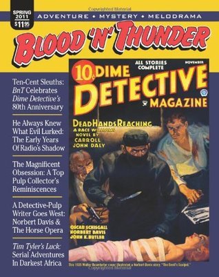 This issue features a lengthy section devoted to DIME DETECTIVE, the long-running pulp magazine that was more influential to the development of hard-boiled crime fiction than any other save the legendary BLACK MASK. In addition to an overview of DIME DETECTIVE, the Spring 2011 BLOOD 'N' THUNDER also has a never-before-reprinted story from the magazine's November 1931 debut Frederick Nebel's "Death Alley," starring the inimitable Cardigan of the Cosmos Detective Agency. Martin Grams Jr. presents a detailed history of The Shadow's early years (1930-32) on radio, famous collector Walker Martin reminisces about collecting pulps, Daniel J. Neyer covers the 1937 cliffhanger serial TIM TYLER'S LUCK, Ed Hulse discusses a 1941 Wild Bill Elliott "B" Western adapted from a story by detective-pulp specialist Norbert Davis, and more. This 108-page issue is packed with illustrations.