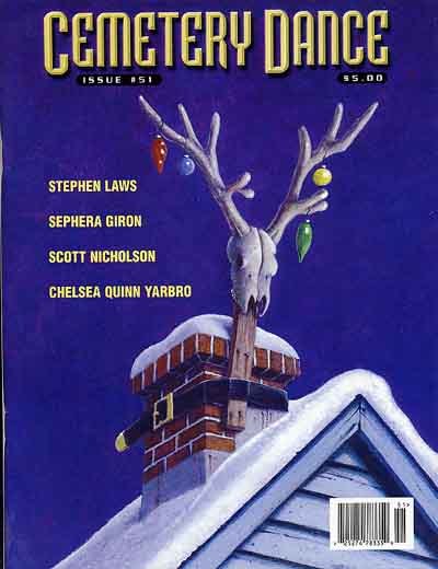 3 • Words from the Editors (Cemetery Dance #51) • [Editorial (Cemetery Dance)] • essay by Robert Morrish3 • Words from the Editors (Cemetery Dance #51) • [Editorial (Cemetery Dance)] • essay by Richard Chizmar4 • A Conversation with Stephen Laws • interview of Stephen Laws • interview by Rick Kleffel14 • Outrage • interior artwork by Chad Savage15 • Outrage • short story by Stephen Laws22 • Author's Note (Outrage) • essay by Stephen Laws24 • From the Dead Zone: Stephen King News (Cemetery Dance #51) • [From the Dead Zone] • essay by Bev Vincent30 • S& Man • interior artwork by Julia Morgan-Scott31 • S& Man • short story by J. T. Petty38 • Any Way You Slice It, It's Still Just a Loaf ... • [The Mothers and Fathers Italian Association] • essay by Thomas F. Monteleone42 • Watermelon • interior artwork by Alex McVey43 • Watermelon • short story by Scott Nicholson48 • Waves of Fear (Cemetery Dance #51) • essay by Paula Guran50 • Review: Murder of Angels by Caitlín R. Kiernan • review by Paula Guran51 • Review: The Dry Salvages by Caitlín R. Kiernan • review by Paula Guran51 • Review: The Cat's Pajamas & Other Stories by James Morrow • review by Paula Guran51 • Review: A Dirge for the Temporal by Darren Speegle • review by Paula Guran52 • Special Delivery • interior artwork by Randy Broecker53 • Special Delivery • short story by Bev Vincent56 • MediaDrome (Cemetery Dance #51) • [MediaDrome] • essay by Michael Marano62 • A Conversation with Sephera Giron • interview of Sèphera Girón • interview by Nathan Tyler66 • Binky • interior artwork by Chad Savage67 • Binky • short story by Sèphera Girón70 • Collecting Modern Horror (Cemetery Dance #51) • essay by John Pelan72 • Smoke 'Em If You Got 'Em (On Horror as Wisdom, and the Radiant Dawn of Cody Goodfellow) • essay by John Skipp76 • Burning Names • interior artwork by Alex McVey77 • Burning Names • short story by Cody Goodfellow82 • Our Ladies of Darkness: A Conversation with Chelsea Quinn Yarbro • interview of Chelsea Quinn Yarbro • interview by Hank Wagner86 • Mr. Goodnight • interior artwork by Alex McVey87 • Mr. Goodnight • short story by Kealan Patrick Burke92 • A Conversation with Steve Gerlach • interview of Steve Gerlach • interview by Ron Clinton98 • Feature Review: In the Night Room • essay by Bev Vincent98 • Review: In the Night Room by Peter Straub • review by Bev Vincent100 • CD Reviews (Cemetery Dance #51) • essay by various100 • Review of the audio drama "Afterhell: Dark Descent" created by Joe Median • essay by Wayne Edwards100 • Review: 100 Jolts by Michael A. Arnzen • review by Hank Wagner100 • Review: The Atrocity Archives by Charles Stross • review by Rick Kleffel101 • Review: Banquet for the Damned by Adam L. G. Nevill • review by William P. Simmons101 • Review: Black Fire by James Kidman • review by Mark Louis Baumgart101 • Review: By Reason of Darkness by William P. Simmons • review by Garrett Peck102 • Review: Coffin Blues by Tom Piccirilli • review by Hank Wagner102 • Review: The Coma by Alex Garland • review by Rick Kleffel102 • Review: Compositions for the Young and Old by Paul G. Tremblay • review by David Niall Wilson102 • Review: CrissCross by F. Paul Wilson • review by Hank Wagner103 • Review: Damned: An Anthology of the Lost by David G. Barnett • review by William D. Gagliani103 • Review: Dark Places by Jon Evans • review by Wayne Edwards103 • Review: Dead Lines by Greg Bear • review by Rick Kleffel104 • Review: Deep Blue by David Niall Wilson • review by William D. Gagliani104 • Review: The Double Shadow by Clark Ashton Smith • review by William D. Gagliani104 • Review: Duel & The Distributor by Richard Matheson • review by William P. Simmons104 • Review of nongenre Eye for an Eye by Joel Ross • essay by William D. Gagliani105 • Review: Dust of Eden by Thomas Sullivan • review by David Niall Wilson106 • Review of the soundtrack to "Godzilla: 50th Anniversary Edition", music by Akira Ifukube • essay by Randall D. Larson106 • Review: Family Inheritance by Deborah LeBlanc • review by Hank Wagner106 • Review: Father Exorcist by K. Sheehan • review by Garrett Peck106 • Review: The First Cut by Peter Robinson • review by Wayne Edwards107 • Review: Green Grow the Rushes-Oh by Jay Lake • review by Rick Kleffel107 • Review: Havoc After Dark by Robert Fleming • review by Wayne Edwards107 • Review: In This Skin by Simon Clark • review by Hank Wagner108 • Review: Iron Council by China Miéville • review by Rick Kleffel108 • Review: The Labyrinth by Catherynne M. Valente • review by David Niall Wilson108 • Review: The Lebo Coven by Stephen Mark Rainey • review by David Niall Wilson108 • Review: Liquor by Poppy Z. Brite • review by Garrett Peck109 • Review: The Manor by Scott Nicholson • review by William P. Simmons109 • Review: Meg: Primal Waters b...