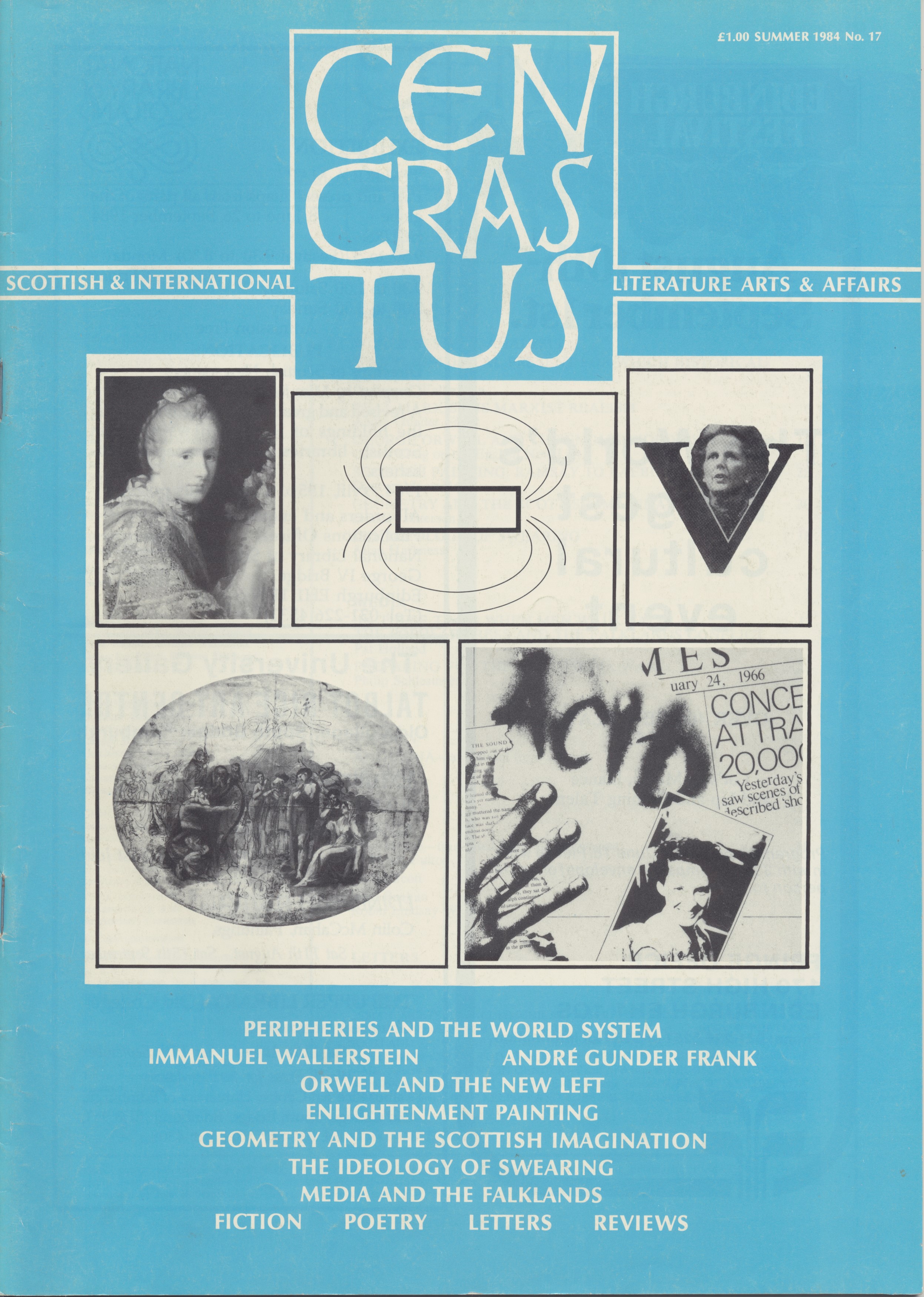 FeaturesWorld Systems Analysis by Geoffrey ParkerWhich Historical Present for Which Historical Future? by Immanuel WallersteinReal Marxism is Marxist Realism by Andre Gunder FrankGeoege Orwell and the English Ideology (Part 2), Cairns Craig on the English New Left"In These Times When Men walk Tall": The Popular Press and the Falklands Conflict by Patricia HollandPreparing for the Next Media War by Philip SchlesingerScottish Painting: Ramsay to Raeburn by Duncan MacmillanGeometry and the Scottish Imagination by Lindsay PatersonThe Ideology of Swearing by Allan HarknessFictionAngusina, an extract from a novel by Ian StephenPoetryPoems by Olav Hauge, David Scott, Tom Buchan and Robin Lindsay WilsonReviewsOssian Meets the Communications Revolution: Mike Alexander, How to be Celtic, reviewed by Christopher HarvieGarioch: Robin Fulton (ed.), Complete Works of Robert Garioch, reviewed by Edwin MorganThe Shorter Form: Valerie Shaw, The Short Story: A Critical Introduction, reviewed by Robert CrampseyFortress Scotland... and After: Malcolm Spaven, A Guide to the Military Presence; and C. Philips and I. Ross, The Nuclear Casebook: An Illustrated Guide, reviewed by Tom HubbardPanopticon or Pleasure Dome?: Formations Editorial Board (eds.), Formations of Pleasure, reviewed by Stan SmithNorman Malcolm Macdonald, Calum Tod, reviewed by John BurnsFrom Castlemilk to Morningside: Gordon Brown and Robin Cook, Scotland: The Real Divide, reviewed by Alan SinclairMichelene Wandor (ed.), On gender and Writing, reviewed by Carol AndersonBrian Friel, The Diviner, reviewed by Harry RitchieCanada's Daughters: Alice Munro, The Moons of Jupiter and Margaret Atwood, Bodily Harm, reviewed by Lynette HunterPoetry as the Crow Flies: Martin Booth, Looking for the Rainbow Sign: Poems of America; Matthew Sweeney, A Round House; Ruth Fainlight, Climates: Francis Horovitz, Snow Light, Water Light; Helen Dunmore, The Apple Fall; and Ronald Bottrall, Against a Setting Sun: Poems 1974 - 1983, reviewed by Stan SmithOf Kelpies and Burkers: Duncan Williamson, Fireside Tales of the Traveller Children, reviewed by Christine Reid