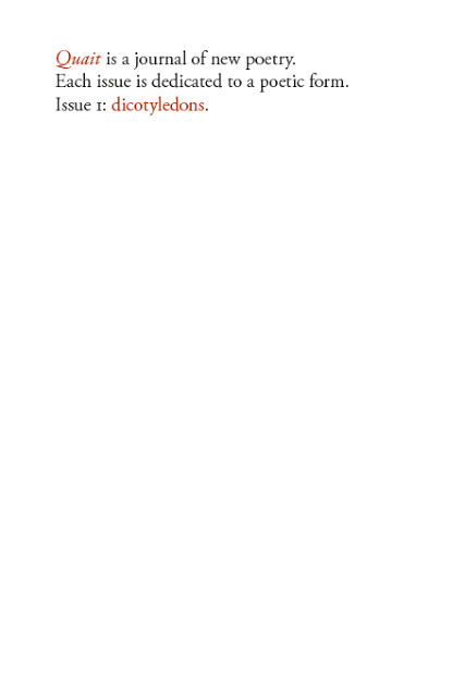 Quait is a journal of concrete & formal poetry. Each issue is dedicated to a specific poetic form, and issue one features 15 'dicotyledons' by a number of poets. A dicotyledon typically comprises two words that differ by one letter. For instance 'previous' & 'precious'. The name comes from botany, meaning a seed that contains two embryonic leaves.CONTRIBUTORSAram SaroyanJulie JohnstoneAlec FinlayDavid SpittleRichard SkeltonGerry LooseIra LightmanKevin MacNeilGreg ThomasStephen NelsonAlistair Peebles Ken CockburnJeff Hilson Kathryn Gerard Numbered edition of 250, hand-bound paperbackedited by Luke Allan in Edinburgh, July 2013.