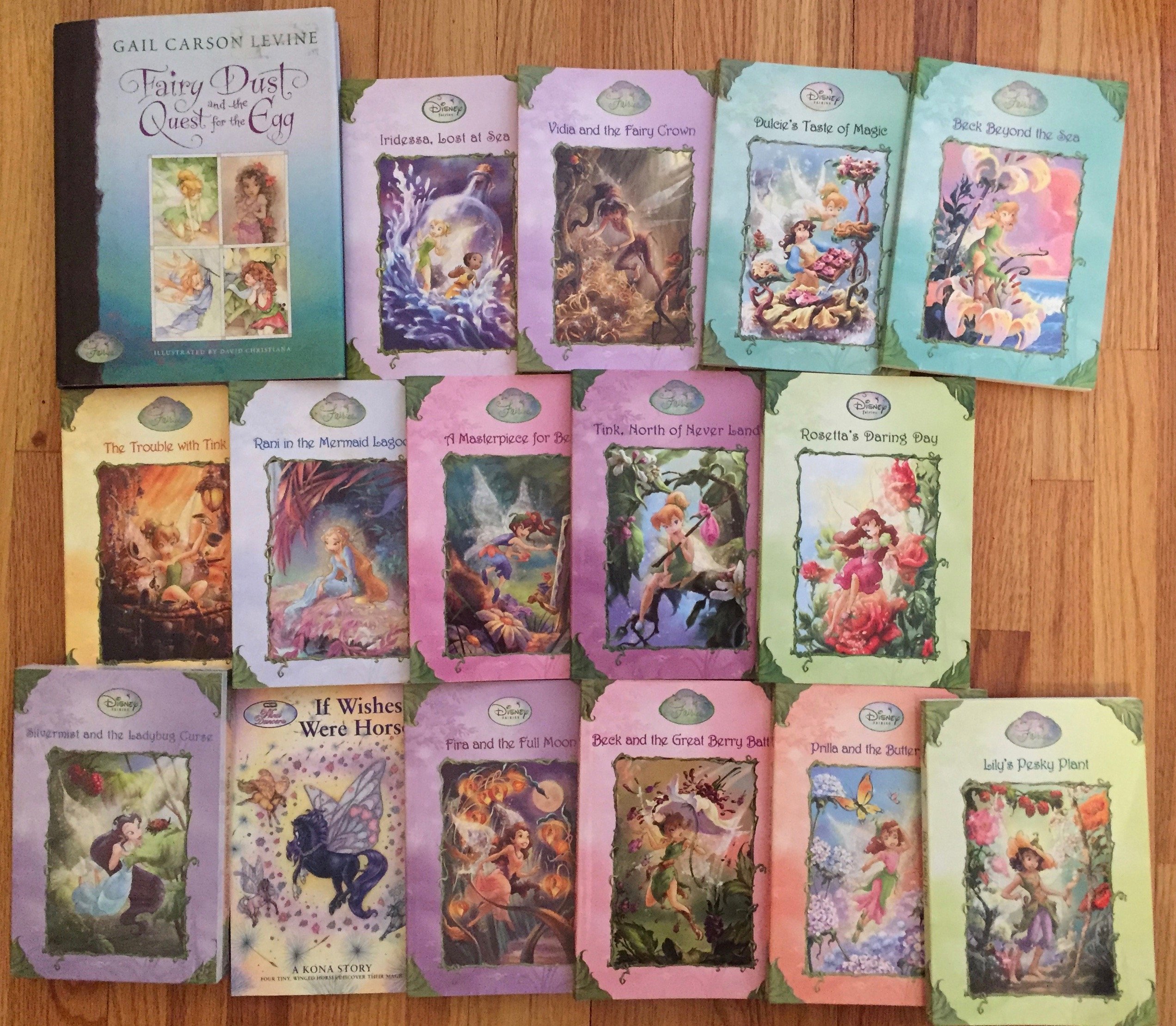 Includes a set of 17 Fairy Dust and the Quest for the Egg by Gail Carson Levine (Hardcover) If wishes Were A Kona Story, A Masterpiece for Bess, Beck and the Great Berry Battle, Beck Beyond the Sea, Dulce’s Taste of Magic, Fawn and the Mysterious Trickster, Fira and the Full Moon, Iridessa, Lost at Sea, Lily’s Pesky Plant, Prilla and the Butterfly Lie, Rani in the Mermaid Lagoon, Rosetta’s Daring Day, Silver mist and the Ladybug Curse, Tink, North of Never Land, The Trouble with Tink, Vidia and the Fairy Crown