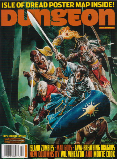 Dungeon drops Polyhedron for an all Dungeons and Dragons format that remains consistent through the final issue, typically made up of three adventure module segments: low level (Mad God's Key,) medium (Torrents of Dread, Exploring the Isle of Dread,) and high (Thirteen Cages.) Columns: Erik Mona: Editorial on the new format, Prison Mail, Monte Cook's Dungeoncraft ported over from Dragon Magazine, and Wil Wheaton's first Wil Save. Cartoons: The Portent, Mt. Zogon, and Downer. Campaign Workbook: The Dungeon, The Journey, Critical Threat.