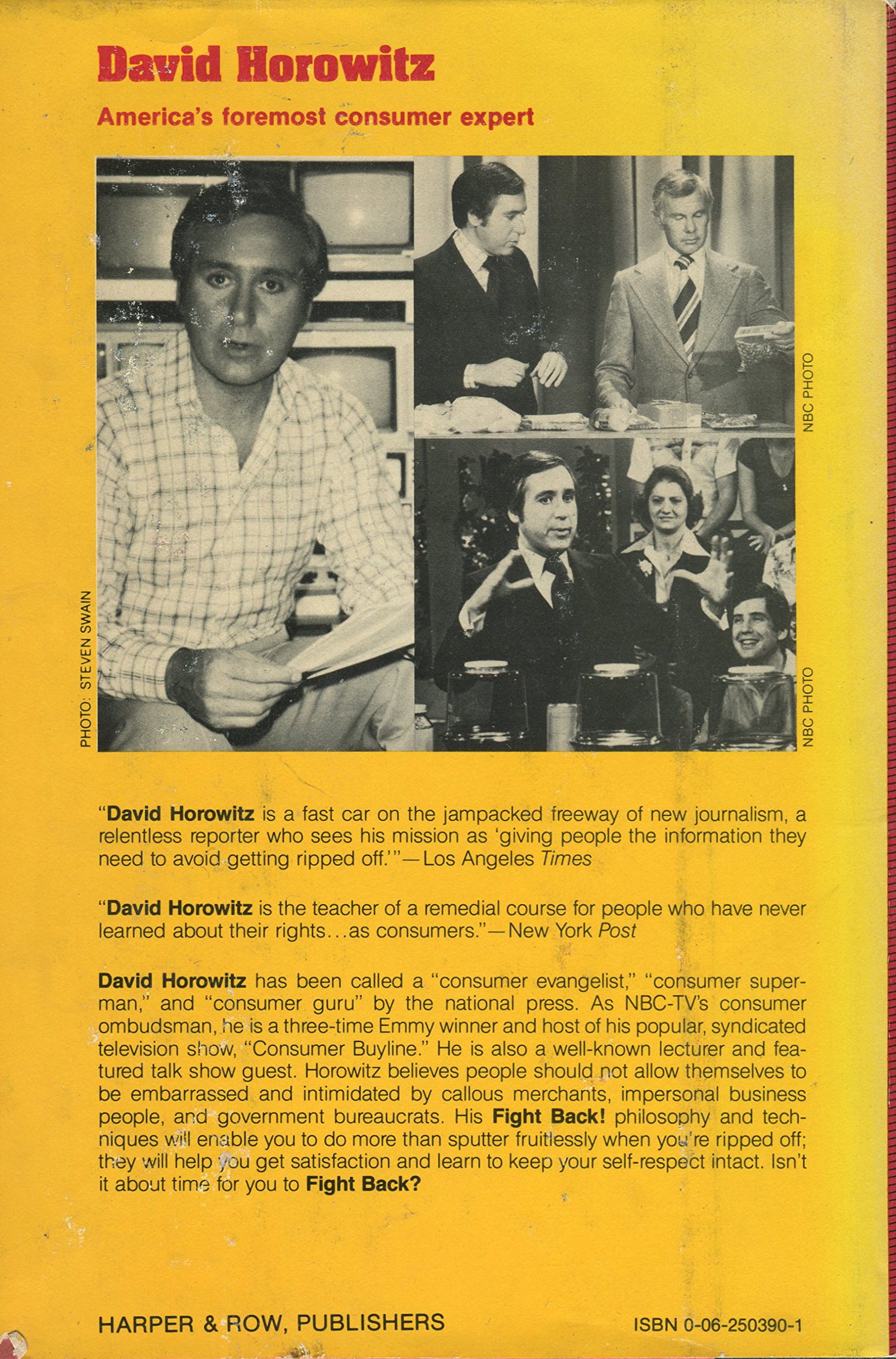 Do you feel cheap when you add up the c heck in that fancy restaurant as the waiter glares over your shoulder? Do you keep a can opener that falls apart the day you buy it, rather than go through the hassle of demanding your money back? Do you meekly pay up when, after your third visit to the mechanic, your car still won't start on rainy days? Then Fight Back! was written just for you.David Horowitz, America's foremost consumer expert, brings assertiveness training to the marketplace; he can make you the kind of person no one will push around with bad service or inferior goods.All you need are two the determination never to be taken advantage of and solid information about what to do if you are ripped off - and how to avoid it in the first place.From spotting a phony advertisement to making sure your credit rating isn't ruined by a computer, Fight Back! gives you the tools you need to make sure you get what you entitled to. Here are some of the areas included in this vital consumer Automobiles, Supermarkets, Restaurants, Mail Order and Professionals.Special supplements give you even more to write a complaint letter that gets result, not excuses. A complete directory of federal consumer offices to help you with almost any problem, "Action Line" broadcasters and journalists, listed state by state. A table of each state's private consumer groups. And much more.Isn't it time to take you name off the "sucker list"? As a consumer you have more power than you know. It's time to use it.