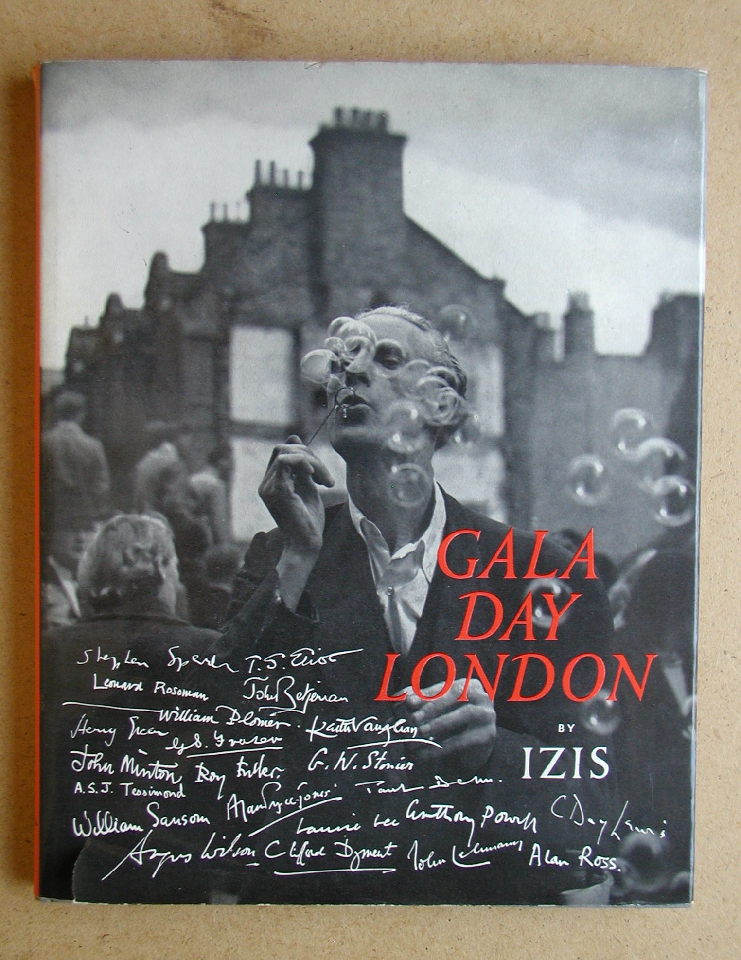 Gala Day London. Photography by Izis Bidermanas. Text by John Betjeman, Paul Dehn, Clifford Dyment, T. S. Eliot, G. S. Fraser, Roy Fuller, Henry Green, Alan Pryce-Jones, Laurie Lee, John Lehmann, C. Day Lewis, John Minton, William Plomer, Anthony Powell, Leonard Rosoman, Alan Ross, William Sansom, Stephen Spender, G. W. Stonier, A. S. J. Tessimond, Keith Vaughan, and Angus Wilson. 1953 hardcover published by Harvill Press, London. Illustrated with black-and-white photographs.