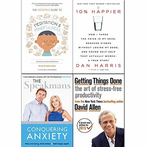 Getting Things Done,Conquering Anxiety,Headspace Guide to Mindfulness & Meditation,10% Happier 4 Books Collection Set. Description:- Getting Things Done: Since it was first published almost fifteen years ago, David Allen's Getting Things Done has become one of the most influential business books of its era, and the ultimate book on personal organization. 'GTD' is now shorthand for an entire way of approaching professional and personal tasks, and has spawned an entire culture of websites, organizational tools, seminars, and offshoots. Conquering Anxiety: 'I've seen their work first hand when it came to my own fear of flying - they are a great team' Holly Willoughby 'I never believed in miracles until I met the Speakmans' Jake Roche Nik and Eva Speakman have helped thousands of everyday people live an anxiety-free life and feel happier. The Headspace Guide to Mindfulness & Meditation: Demystifying meditation for the modern world: an accessible and practical route to improved health, happiness and well being, in as little as 10 minutes.Andy Puddicombe, founder of the celebrated Headspace, is on a mission: to get people to take 10 minutes out of their day to sit in the now. 10% Happier: After having a nationally televised panic attack, Harris knew he had to make some changes. A lifelong non-believer, he found himself on a bizarre adventure and realised that the sources of his problems was the very thing he always thought was his greatest asset: the incessant, insatiable voice in his head, which had propelled him through the ranks of a hyper-competitive business, but had also led him to make the profoundly stupid decisions that provoked his on-air freak-out.