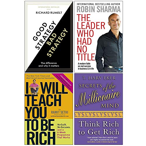 Please Note That The Following Individual Books As Per Original ISBN and Cover Image In this Listing shall be Dispatched Collectively: Good Strategy Bad Strategy, The Leader Who Had No Title, I Will Teach You To Be Rich, Secrets of the Millionaire Mind 4 Books Collection Set: Good Strategy Bad Strategy: When Richard Rumelt's Good Strategy/Bad Strategy was published in 2011, it immediately struck a chord, calling out as bad strategy the mish-mash of pop culture, motivational slogans and business buzz speak so often and misleadingly masquerading as the real thing. The Leader Who Had No Title: Robin Sharma believes there are certain skills and attitudes that allow you to rise to extraordinary success. In his powerful new parable, he offers a story designed to help people from all walks of life to achieve great things. I Will Teach You To Be Rich: I Will Teach You To Be Rich is a practical approach delivered with a non-judgemental style based on the four pillars of personal finance - banking, saving, budgeting and investing - and the wealth-building ideas of personal entrepreneurship.Witty, entertaining, wise and practical, Ramit Sethi explains how to automate your money flow - i.e. Secrets of the Millionaire Mind: Mastering the Inner Game of Wealth. Have you ever wondered why some people seem to achieve wealth effortlessly while others work just as hard but still struggle financially? In this fresh and original book T. Harv Eker explains how you too can master the inner game of money so that you will not only achieve financial success but keep it once you have it.