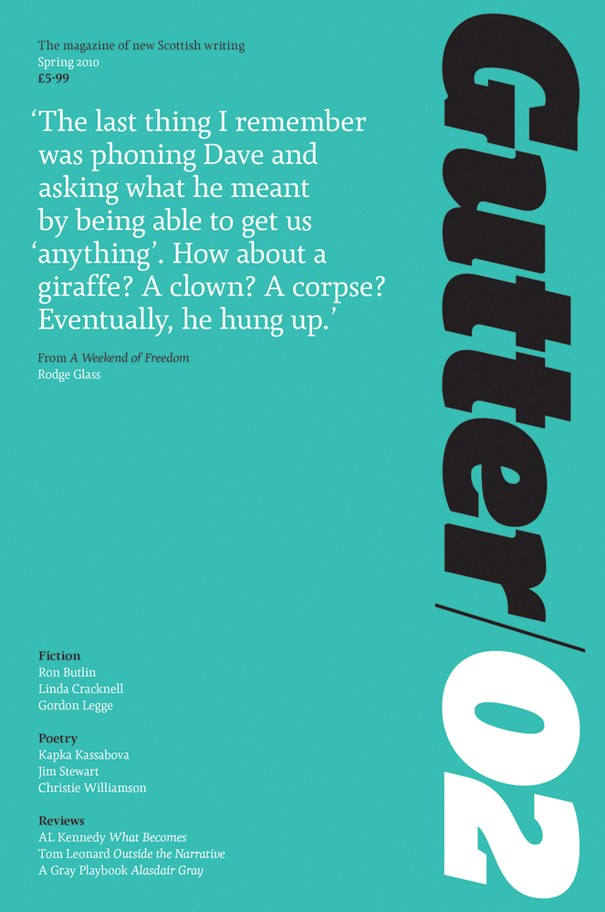 Gutter is an award-winning, high quality, printed journal for fiction and poetry from writers born or living in Scotland. The editors believed there is a need for an energetic, ambitious magazine dedicated exclusively to the best in new Scottish creative writing. Issue 02 features published and emerging writers alike, including Ron Butlin, Sophie Cooke, Linda Cracknell, Rodge Glass, Gordon Legge, Alan Bissett, Irene Hossack, Kapka Kassabova, Tom Lappin, Gregory Norminton, Christopher Wallace, and Christie Williamson.