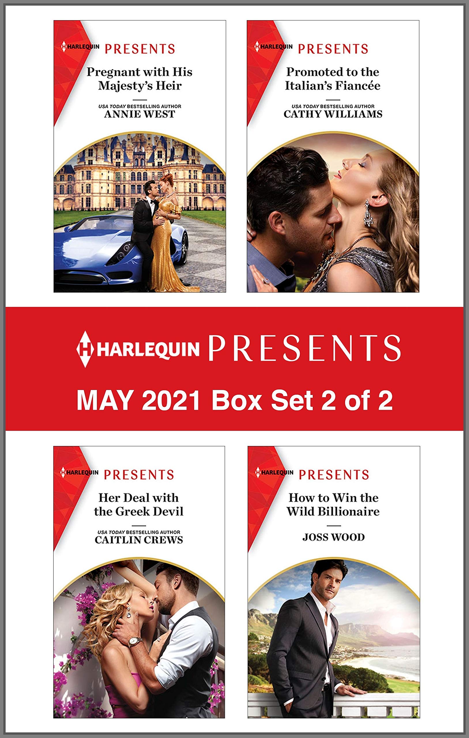 Harlequin Presents brings you four full-length stories in one collection! Experience the glamorous lives of royals and billionaires, where passion knows no bounds. Be swept into a world of luxury, wealth and exotic locations.This box set PREGNANT WITH HIS MAJESTY’S HEIRBy USA TODAY bestselling author Annie WestOne reckless night with an unforgettable stranger leaves Aurélie expecting! She’s scandalized to discover her baby’s father is new king Lucien! Now she must confess all to the reluctant royal and await His Majesty’s reaction…HER DEAL WITH THE GREEK DEVIL (A Rich, Ruthless & Greek novel)by USA TODAY bestselling author Caitlin Crews Virgin Molly knows the danger of walking into a powerful man’s den. Yet only an outrageous deal with Greek billionaire Constantine will save her beloved mother. He has always been sinfully seductive but, bound by their pact, Molly burns for him. And there’s no going back…PROMOTED TO THE ITALIAN’S FIANCÉE (A Secrets of the Stowe Family novel)by USA TODAY bestselling author Cathy WilliamsHeartbroken Izzy flees to California to reconnect with her past and finds herself in a business stand-off with devastatingly handsome tycoon Gabriel. He’s ready to bargain – if she first becomes nanny to his daughter…then his fake fiancée?HOW TO WIN THE WILD BILLIONAIRE (A South Africa’s Scandalous Billionaires novel)by Joss WoodBay needs the job of revamping Digby’s luxurious Cape Town hotel to win custody of her orphaned niece. That means resisting their off-the-charts chemistry. It’s made harder when Digby gives her control over if – and when – she’ll give into his oh-so tempting advances…For more stories filled with passion and drama, look for Harlequin Presents May 2021 Box Set – 1 of 2