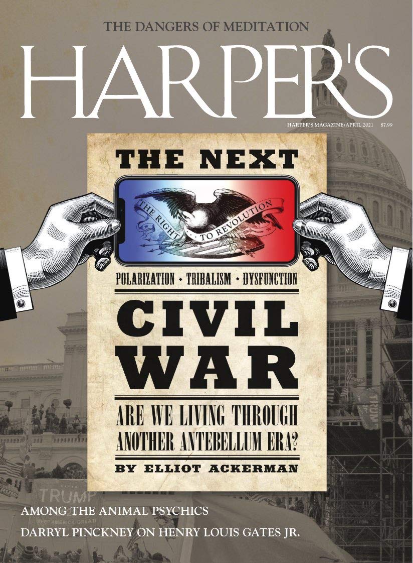 Harpers Magazine: The Dangers of Meditation, The Next Civil War, April 2021