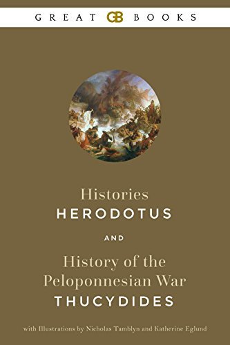 Presenting "Histories by Herodotus and History of the Peloponnesian War by Thucydides with Illustrations by Nicholas Tamblyn and Katherine Eglund." These classics are part of The Great Books Series by Golding Books. The classic translation of Histories is by George Rawlinson, and of History of the Peloponnesian War by Richard Crawley. Herodotus was born in Halicarnassus (then of the Persian Empire) in the fifth century BC, but the precise date is uncertain. A wide traveler that scholars believe lived for a time in Athens, his work Histories, describing the wars between Greece and Persia, is considered the founding work of history in Western literature. From his own scant references to himself, and as nothing in the work can be dated past 430 BC with certainty, it is supposed that Herodotus died not long afterwards, possibly at the age of sixty. Thucydides was born in Halimous (modern Alimos) in South Athens in 460 BC. A general and an historian, little else is known about his life—in History of the Peloponnesian War, Thucydides states that he fought in the war, contracted the plague, and was subsequently exiled by the democracy. The work is regarded as one of the earliest scholarly works of history. Thucydides died in about 400 BC.