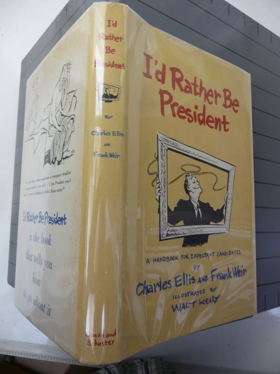 New Simon and Schuster. Copyright 1956. First Edition. First Printing. Hardcover. [minor wear to book, light age-tanning to page edges; jacket shows mild wear]. (cartoon drawings) Tongue-in-cheek how-to-run-for-high-office handbook that "charts your course from the inevitable denial that you are a candidate to the polite wire of condolence to your defeated opponent," including such helpful advice as "how to throw your hat into the ring with a forthright statement which, carefully avoiding anything specific, demands justice, honor, thrift, generosity, tolerance, courage, and decency in public affairs -- thus at one stroke indicting any opponent as an unfair, biased, cowardly, stingy, ne'er-do-well of terrible habits." As timely now as it's ever been -- and who better to illustrate this cornucopia of hypocrisy than the wonderful Walt Kelly?