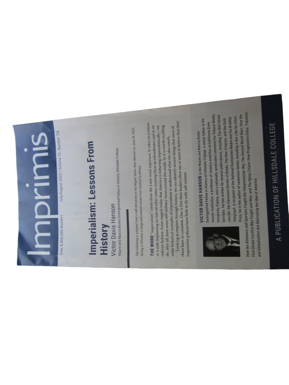 Imprimis issue July/August 2023 is titled, Lessons From HIstory by Victor Davis Hanson, Wayne and Marcia Buske Distinguished Fellow in History, Hillsdale College.