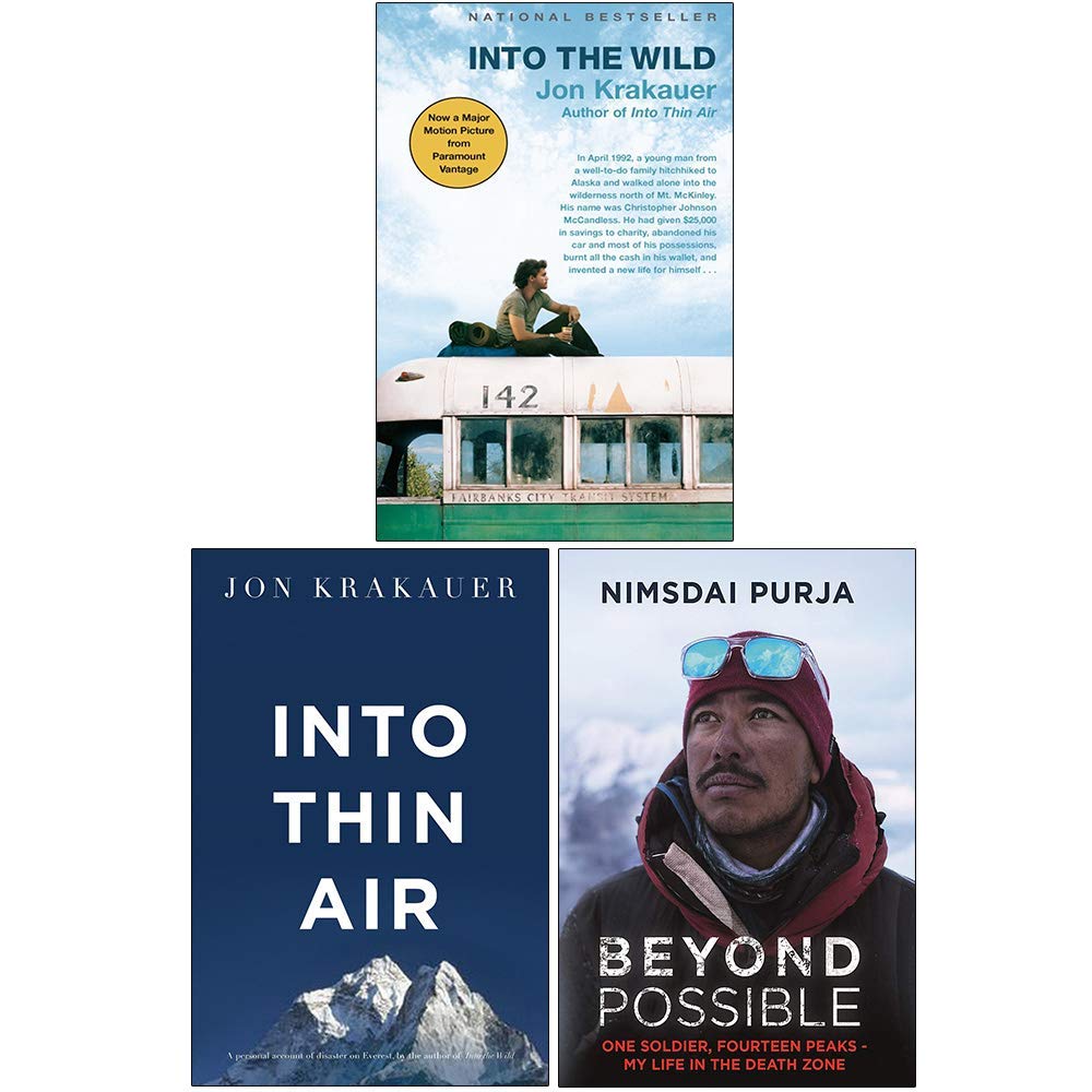 Into the Wild Jon Krakauer's Into the Wild examines the true story of Chris McCandless, a young man, who in 1992 walked deep into the Alaskan wilderness and whose SOS note and emaciated corpse were found four months later, internationally bestselling author Jon Krakauer explores the obsession which leads some people to explore the outer limits of self, leave civilization behind and seek enlightenment through solitude and contact with nature. Into Thin Air In March 1996, Outside magazine sent veteran journalist and seasoned climber Jon Krakauer on an expedition led by celebrated Everest guide Rob Hall. Despite the expertise of Hall and the other leaders, by the end of summit day, eight people were dead. Krakauer's book is at once the story of the ill-fated adventure and an analysis of the factors leading up to its tragic end. Written within months of the events it chronicles, Into Thin Air clearly evokes the majestic Everest landscape. As the journey up the mountain progresses, Krakauer puts it in context by recalling the triumphs and perils of other Everest trips throughout history. Beyond Possible In Beyond Possible Nimdai Purja tells the story of his life before his recent epic achievement of leading the team that scaled K2 in winter. He reveals how leadership, a willingness to learn, integrity and collaboration are essential qualities behind the world's greatest mountaineering feats. Nimsdai is the first man ever to summit all 8000m 'Death Zone' peaks in less than 7 months, and this book reveals the man behind the climbs - how his early life in Nepal and Special Forces training made him the person to go beyond possible...