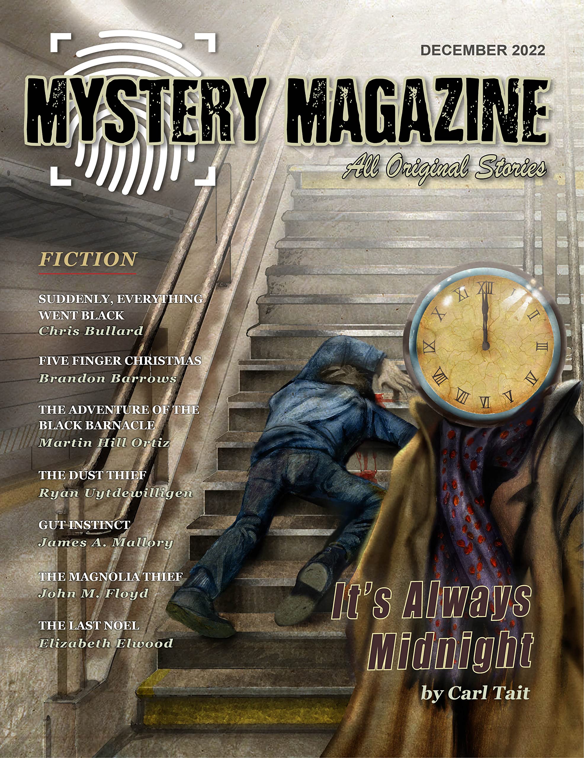 At the cutting edge of crime fiction, Mystery Magazine presents original short stories by the world’s best-known and emerging mystery writers. The stories we feature in our monthly issues span every imaginable subgenre, including cozy, police procedural, noir, whodunit, supernatural, hardboiled, humor, and historical mysteries. Evocative writing and a compelling story are the only certainty.Get ready to be surprised, challenged, and entertained--whether you enjoy the style of the Golden Age of mystery (e.g., Agatha Christie, Arthur Conan Doyle), the glorious pulp digests of the early twentieth century (e.g., Dashiell Hammett, Raymond Chandler), or contemporary masters of mysteryIn this In our cover feature, “It's Always Midnight” by Carl Tait, a peculiar man is observed at the scene of several seemingly unrelated deaths forcing a jaded New York City police detective to uncover the dark connection between the stranger and the fatalities.“The Dust Thief” by Ryan Set in the early 1950s, a bitter travelling vacuum salesman is attempting to try and sell the device to homes around central California. Though he fails at selling any, he discovers that his demonstrations are inadvertently sucking up a thin layer of gold dust.In “Suddenly, Everything Went Black” by Chris Bullard, a detective investigating the missing Von Radium tiara gets smacked on the head a few too many times to make any sense of things.“The Last Noel” by Elizabeth When Grannie Forbes falls face first into the Christmas pudding, no one in the family is particularly sorry, but soon the questions begin. Did someone take a hand to ensure that this was her last Noel?In “Gut Instinct” by James A. Mallory, private investigator Alonzo Probe is feeling pretty good on the eve of 1975. Driving home from his latest job, he spots a former lover manhandled into a car and takes chase.“Five Finger Christmas” by Brandon The holiday season is a wonderful time, but there's always someone who has to go and ruin everyone else's fun …“The Adventure Of The Black Barnacle” by Martin Hill Professor Moriarty convinces detective and next door neighbor to Sherlock Holmes to steal a precious jewel. Moriarty has an even more sinister goal in mind.“The Magnolia Thief” A You-Solve-It by John M. Fran Valentine is at it again, meddling in her daughter Sheriff Lucy’s case.♥ Custom Cover Art By Robin Grenville Evans