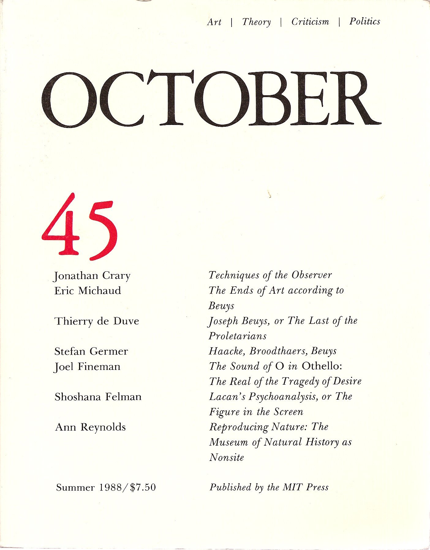A leading journal, published at MIT, and edited by Rosalind Krauss, Joan Copjec, Douglas Crimp, and Annette Michelson. This issue includes Jonathan Crary; articles on JOSEPH BEUYS by Eric Michaud, Thierry de Duve, and Stefan Germer; Shoshana Felman on JACQUES LACAN; Joel Fineman; Ann Reynolds.