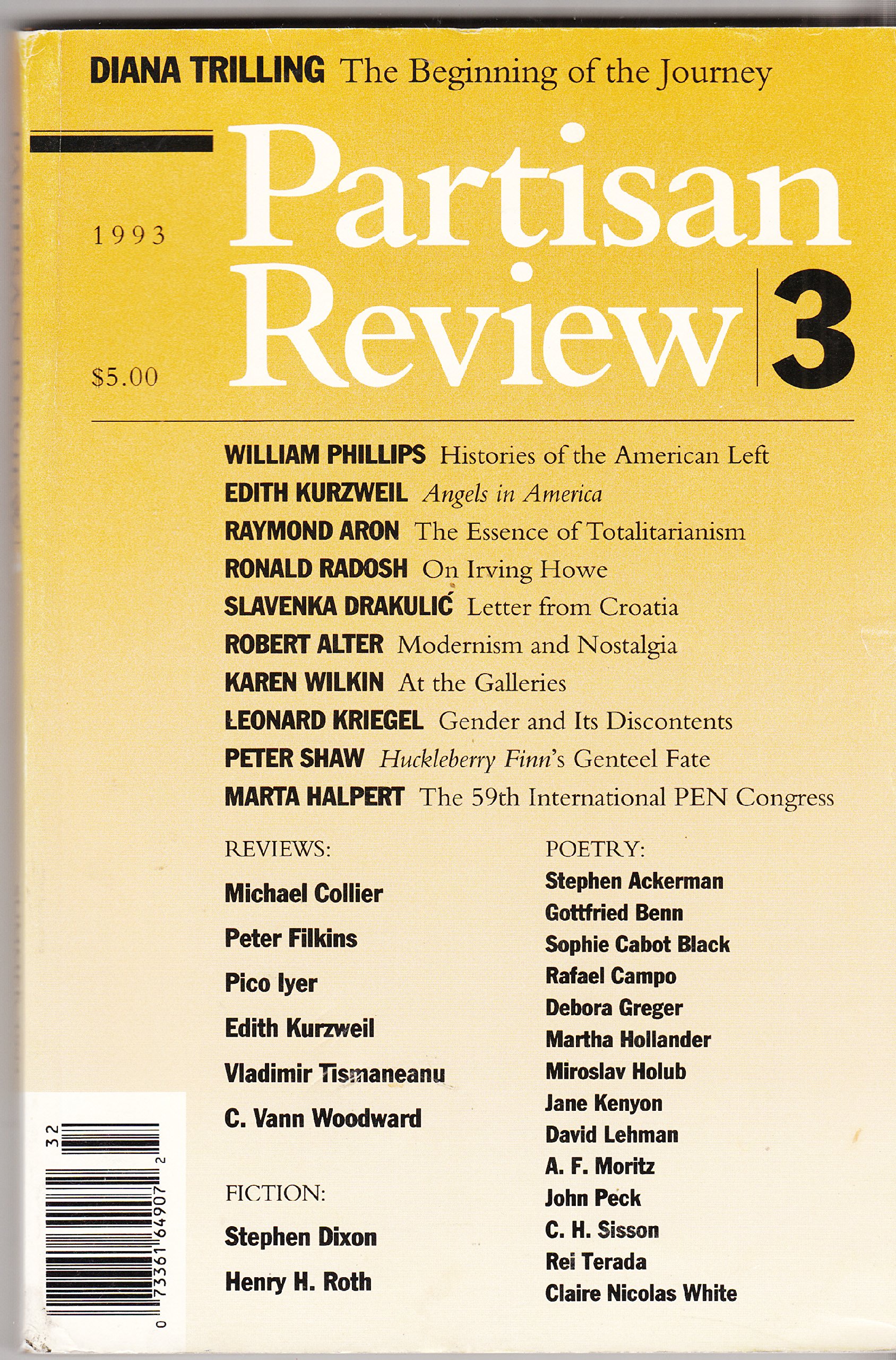 Essays, memoir, poetry, fiction, and reviews by leading Pico Iyer, C. Vann Woodward, Diana Trilling, Edith Kurzweil, on Angels in America, Ronald Radosh, on Irving Howe; others.