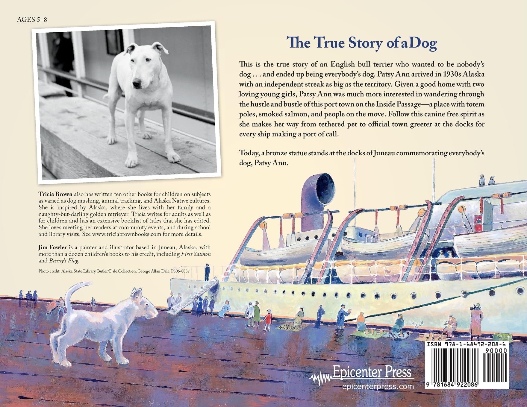 In 1929, Patsy Ann arrived in Juneau, Alaska, with an independent streak as big as the territory. The English bull terrier cycled through a couple of households, running away each time, making it clear that she was nobody's dog. She was everybody's dog. Meet the canine free spirit who went from tethered pet to official town greeter at the docks, meeting every ship that came to port for all of the 1930s. Although she was impaired, somehow Patsy Ann knew whenever a ship was coming. A bronze statue of Patsy Ann stands at the docks today, still looking up the channel for the next arrival