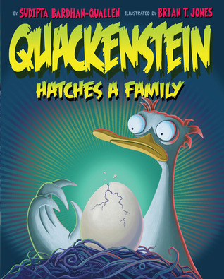 Crack open this tale of family and fright, as cute as it is creepy. All the animals in the zoo have friends and family to play with and love. All of them, that is, except Quackenstein. Lonely and bitter in his ramshackle corner, he decides to adopt an egg. He cares for it diligently, waiting until the moment when it will hatch a baby duck of his own. On a dark and stormy night, the egg hatches, Quackenstein cackles, and lightning strikes, but wait—what’s this? That baby’s not a duck! What will he do? Where can he hide? And will Quackenstein ever find someone (or something) to cuddle? Sudipta Bardhan-Quallen’s clever rhyming text is perfectly paired with cute and spooky art from Brian T. Jones."Jones gleefully uses every cliché in the book, from lurid lettering and backgrounds to effective use of silhouettes and shadows. Bardhan-Quallen, too, takes advantage of horror-movie tropes, but she also mixes in some instruction in the form of cumulative nouns for animals. The surprise twist at the end happily resolves Quack’s fatherless state." -Kirkus Reviews