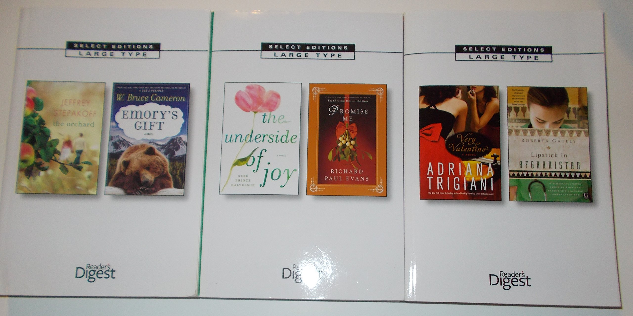 Reader's Digest LARGE TYPE Three Book Bundle Collection of Select Editions Novels, Includes: 2013 the underside of joy and Promise me - 2012 Very Valentine and Lipstick in Afghanistan - 2012 the orchard and Emory's GIFT