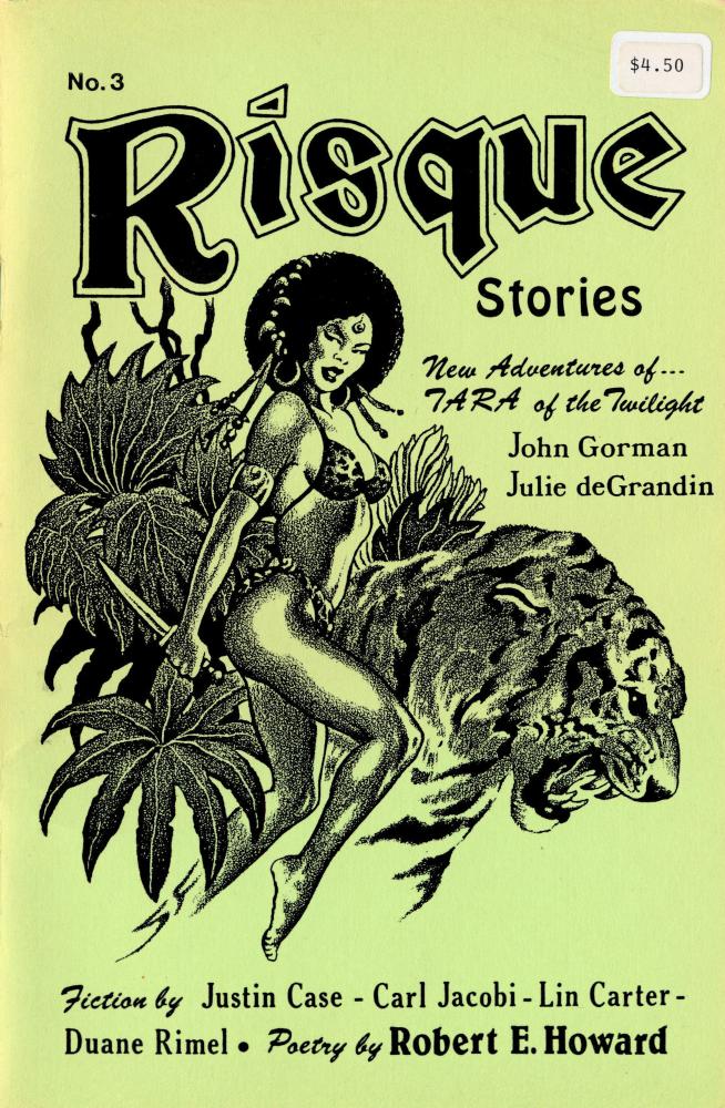 Collection of stories and poems that emulated in content the old spicy pulps. Foreplay • essay by Robert M. Price Woman of the Witch-Flowers • short story by Carl Jacobi Woman of the Witch-Flowers • interior artwork by Barbara LaPlaca House of Dark Desire • short story by Hugh B. Cave [as by Justin Case] House of Dark Desire • interior artwork by Barbara LaPlaca Pale Shadow • [Tara of the Twilight] • short story by Lin Carter Pale Shadow • interior artwork by Barbara LaPlaca Jungle Curse • [John Gorman] • short story by Marc Cerasini and Charles Hoffman [as by Marc A. Cerasini and Charles Hoffman] Jungle Curse • interior artwork by Barbara LaPlaca The Gift • short story by Duane W. Rimel [as by Duane Rimel] The Harlot • poem by Robert E. Howard Julie de Grandin, Psychic Sleuth in "Paris Nitelife" • [Julie de Grandin] • short fiction by Will Murray Julie de Grandin, Phychic Sleuth in "Paris Nitelife" • interior artwork by Mike Harris The Spicy Scribes • essay by Will Murray Readers' Rendezvous • essay by uncredited Letter (Risque Stories #3) • essay by Dixon Smith