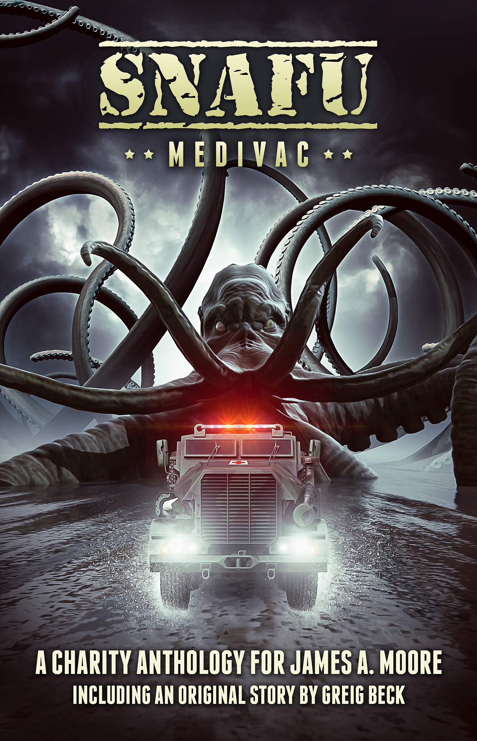 A charity anthology for James A. Moore’s medical costs and ongoing costs of living.120,000 words, with four original stories and eight best-of-SNAFU reprints.+ + +Some of the most important military missions have been medical evacuations – medivacs.Soldiers don’t often fight for themselves. They fight for the guy next to them, their brother, their friend, their family.And they fight hard.In 2019, Cohesion author and friend… hell, more family, really… Jim Moore was suddenly in the struggle of his life. He overcame the Big C, but his fight is ongoing. A fight to pay for all the treatments in a country that has no free public health system, and a fight to claw his way back from the ravages of the very treatment that saved his life.His fight is our fight, and if we don’t fight for our friends, is there anything really worth living for?+ + +All income from SNAFU: Medivac goes to Jim to help pay his bills and keep his household functional.Once this is no longer necessary, the income will transfer to a cancer research or treatment charity.