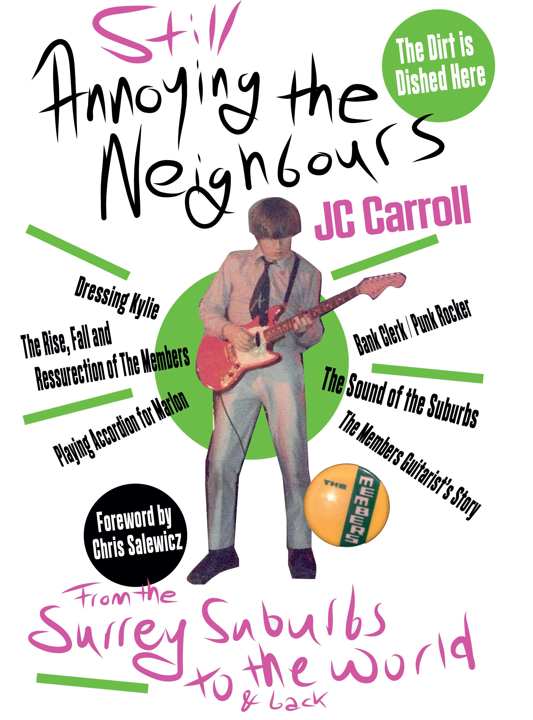 ((Still) Annoying The Neighbours is the Autobiography of JC Carroll - it takes its title from the lyrics of The Members anthem “The Sound of the Suburbs” and traces the journey of Members Songwriter and guitarist JC “Jean-marie” Carroll a boy with three girls names catapulted from suburban obscurity into the punk rock limelight and then flung back onto the music business scrap heap .. It tells the story of a man who is driven to make music, art and clothing a man who is escaping from, but always defined by, the songs of his youth. The book charts his early success through to recording and touring with Legends such as Glen Matlock , Dee Dee Ramone, Johhny Thunders Rat Scabies. Playing accordian for Johnny Depp and Marlon Brando and dressing Kylie Minogue. It traces his rock and roll journey thru glam, Metal, Rock Punk, Electro, Folk and finally onto the silver screen. Like JC’s songs the book is simulataneously funny sad and triumphant. With foreword and editorial help by Marley and Strummer Biographer Chris Salewicz and Artwork and Layout by iMages&co New Wave art guru Malcolm Garrett MBE - This is a quality product. This is what JC writes in his book about his most famous I felt a responsibility to play "The Sound of the Suburbs". That song could and would bring happiness to people that had grown up to it was the sound of their youth and bouncing around to it in a sweaty club for three to four minutes could and would take them back to a time where they were 17 years old with a full head of badly bleached hair, a 28-inch waist, and a fake leather jacket covered in pins and badges. That song was no longer just a it had become a time machine, an elixir of yoof, a magic pill that they could neck with a pint of lager to bring that youth club disco in a scout hut spinning back. It was not just a song, it was “The Sound of the Suburbs”. It was the aspirations and ambitions of thousands of bored provincial teenagers from a hundred satellite towns, bottled and aged in a cellophane wallet in a box in the garage, a time-bomb waiting to go off inside the head of a normally sensible 55 year old.