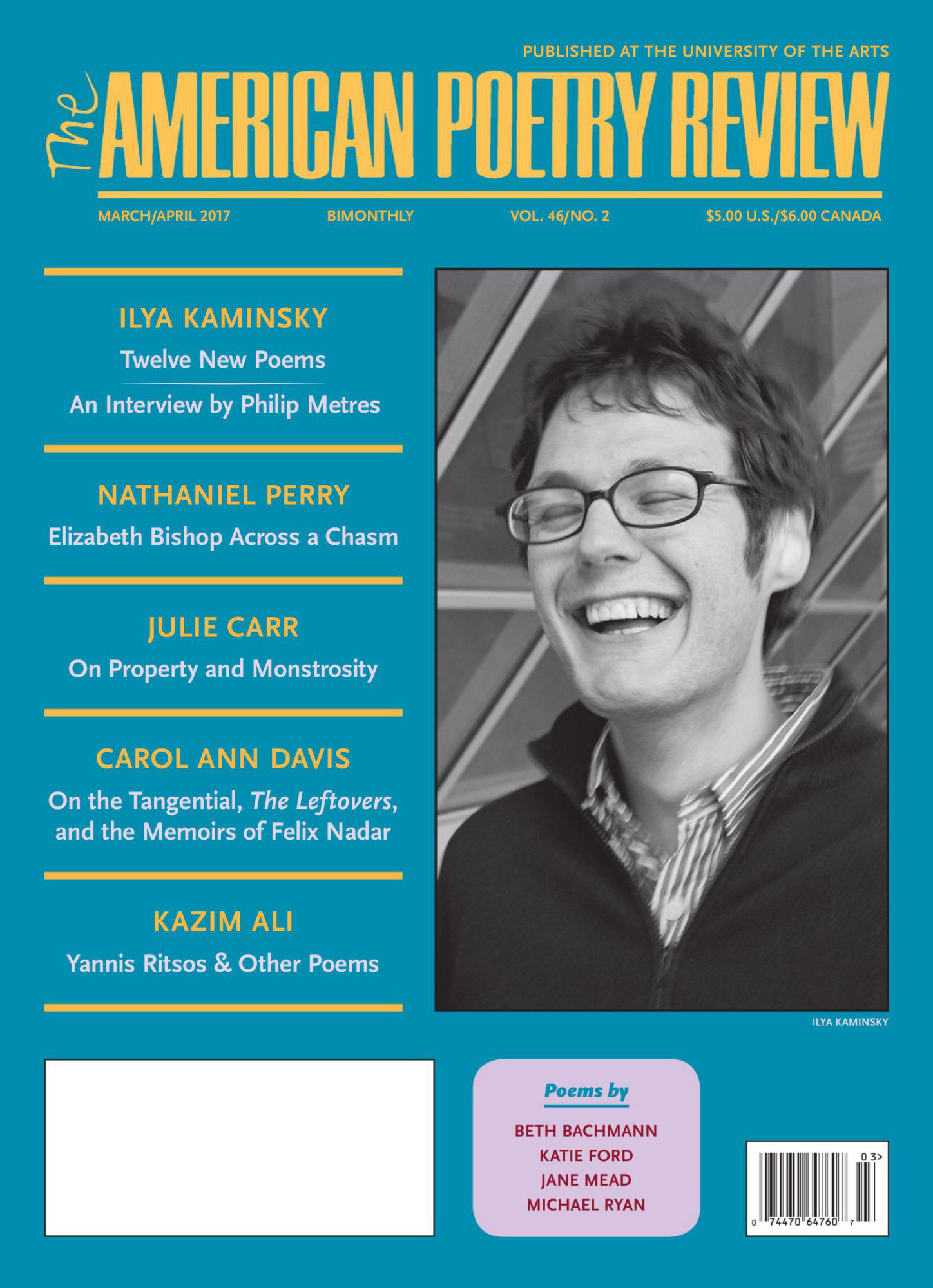 Kazim Ali: Yannis Ritsos • Marie's Crisis • Apasmara Climbs to the Mountain Lake • Night: A Celan VariationBeth Bachmann: Blush • Form • Glass • Mother Outside • /ClosureJoshua Bennett: Metal Poem • When Thy King Was a Boy • Mike Brown Is a Type of ChristNicole Callihan: Dwelling • Snow • The Inevitable Hunger That One Brings to the Thanksgiving TableJulie Carr: On Property and MonstrosityCarol Ann Davis: On the Tangential, The Leftovers, and the Memoirs of Felix NadarAlex Dimitrov: Water • Strangers and FriendsElaine Equi: If Next Week Is Good Friday • More Unisex ColognesKatie Ford: Ten Sonnets: • [Sonnet] 11 • [Sonnet] 12 • [Sonnet] 13 • [Sonnet] 14 • [Sonnet] 15 • [Sonnet] 16 • [Sonnet] 17 • [Sonnet] 18 • [Sonnet] 19 • [Sonnet] 20Ilya Kaminsky: We Lived Happily During the War • While Helicopters Circle the Avenues • Fire • They Shoot into the Crowd to Clear the Central Square • On Earth in My Pajamas • Lullaby • To Live • 2 AM Bombardment • Stories, Written in Air • Police Shovel Sonya into a Car, as Neighbors Watch • Snow Falls and Her Raincoat SwellsIlya Kaminsky: Ilya Kaminsky interviewed by Philip MetresDavid Kirby: Foreign Movies • I CanDiane K. Martin: Our House • Shower Epiphany with LasagnaLaura McCullough: I Am Calling YouJane Mead: HePhilip Metres: Ilya Kaminsky interviewed by Philip MetresCarol Muske-Dukes: Kashmir: Hindu DoctorNathaniel Perry: Somebody Loves Us All: Elizabeth Bishop Across a ChasmMichael Ryan: To Talk About Me • Very Glad • Geriatric Aubade • Submission • The Makeup Artist • Kafka StairmasterJason Schneiderman: Wolf • Wolf and Fox • Scorpion and Wolf • Peter and the Wolf Orchestra • Wolves and SleepDanniel Schoonebeek: Poem with a Gun to Its Head • ArchilochosBruce Weigl: For Night • The Hanoi Winds Bringing Winter to the Old World Elegy • Hoa Sen • Hoa Sen, West Lake, 2010 • Crazy with His Anguish and Dumb with Grief • The Elephant Gift in the Room