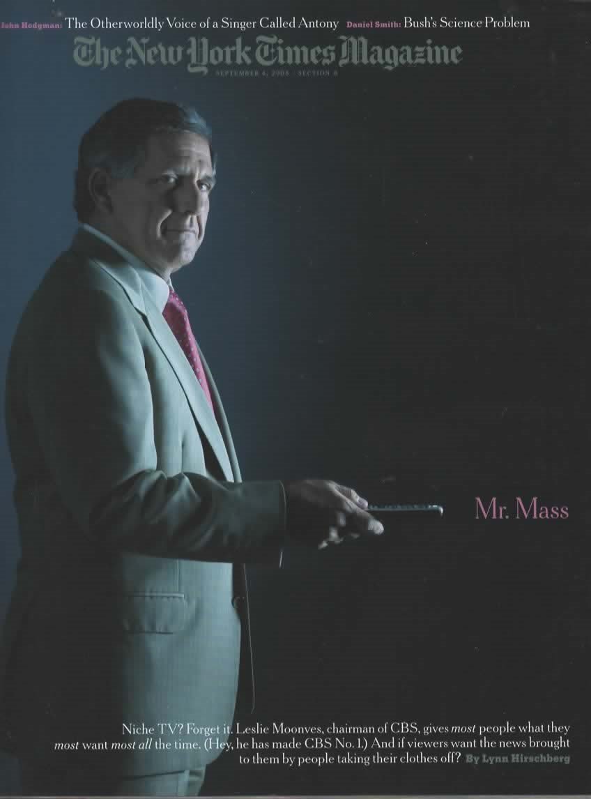 Lynn Hirschberg-Mr Mass Leslie Moonves, John Hodgman-Otherworldly Voice of a Singer Called Antony (and the Johnsons), Daniel Smith-Bush's Science Problem, Deborah Solomon-Marcel Dzama-Drawn to Trouble...Contributors in this George Lange,Lynn Hirschberg,John Hodgman,Daniel Smith,Deborah Solomon,Marcel Dzama,Olivia Mercer,Jonathan Reynolds,David Reiff,Jonathan Kozol,Randy Cohen,Leslie Moonves,David Berreby,Pamela Newton,William Safire,Doug DuBois,Pilar Viladas,Rob Walker