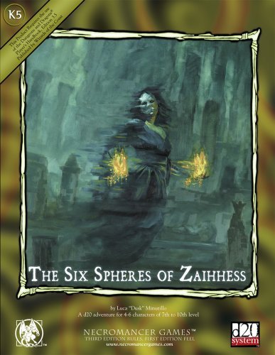 The lord of the region needs help, and the heroes have answered the call. Will they be able to uncover the secret plots of the sect? Can they stop the fiendish rites and impede the rebirth of a god? Or will the world be destined to endure never-ending terror? This harsh area is the perfect environment for the revival of secret rites of pure evil. In the shadow of ageless frests and mountains, hidden within ancient tunnels and ruins, a covert sect attempts to free its god from a planar prison. To do so, they must first recover a potent artifact, the Six Spheres of Zaihhess. A d20 adventure for 4 to 6 characters of 7th to 10th level.