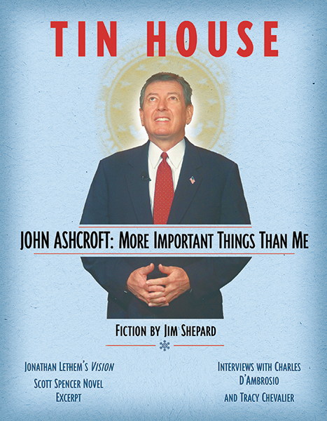 Halle Berry he ain’t, but John Ashcroft, the United States attorney general, is our ideal cover boy for this issue of Tin House. Jim Shepard, in an artful blend of fact and fiction, imagines Ashcroft’s inner life; Australian poet Les Murray conjures haunting images in “At the Widening of War”; novelist Jeffrey Eugenides contributes a dark and humorous essay from Berlin about discovering a Nazi bunker under his office; in Montana, Charles D’Ambrosio talks about the transcendence and hell of self-imposed exile; and from Russia comes Sergey Gandlevsky’ poem, “To My Mother,” in which he writes, “Everything that happened to us will happen again.” These pieces make the case that our best writers illuminate the human condition in ways that can never be captured by the blaze of the CNN lights. Also in this issue is Tin House favorite Jonathan Lethem, with a new story, “The Vision,” as well as an excerpt from Scott Spencer’s highly anticipated novel, A Ship Made of Paper, and an interview with the author of the number-one bestselling novel Girl with a Pearl Earring, Tracy Chevalier. So, please, settle in to someplace safe and take it all in. Peace.