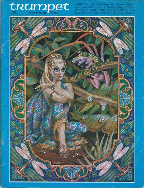 1 • Editorial and Other Petentions (Trumpet #10) • essay by Tom Reamy2 • 2001 Errata • essay by Alex Eisenstein2 • "Uncle Bill's Barrel" • essay by Alex Eisenstein3 • Down in Flames • essay by Larry Niven13 • Persiflage (Trumpet #10) • essay by uncredited19 • Cool Hand Tod • essay by Jomes Michael Martin24 • The Pornographic Soapbox • essay by Phyllis Eisenstein26 • Caution: Cigarette Smoking Is Still a Burning Issue • essay by Ron Wilson (I)30 • The Logic of the Law • essay by Edward E. Smith [as by E. E. Smith]36 • Trumpet People: Rob Pudim • essay by Rob Pudim37 • Medusa Oblongata • short story by Joseph Jones42 • The Science Fantasy Film Revisited • essay by Tom Reamy48 • Don't Touch That Dial! It's Time for the Late, Late Roger Zelazny • essay by Gary N. Hubbard