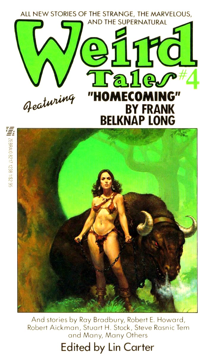 Fourth in the paperback book revival of the Weird Tales magazine, edited by Lin Carter. Has verse by Robert E. Howard and Clark Ashton Smith.Contents: * "The Eyrie" (editorial) (Lin Carter) * "The Next Glade" (Robert Aickman) * "Crocuses" (Charles Sheffield) * "The Belfry" (James Anderson) * "There Are No Ghosts in Catholic Spain" (poem) (Ray Bradbury) * "Homecoming" (Frank Belknap Long, Jr.) * "Compliments of the Season" (John Brizzolara) * "The City of Dread" (Lloyd Arthur Eshbach) * "The Doom Chant of Than-Kul" (poem) (Robert E. Howard) * "Save the Children! " (Steve Rasnic Tem) * "The Sea-Gods" (poem) (Clark Ashton Smith) * "Ooze" (Anthony M. Rud) * "Late Night Final" (Stuart H. Stock) * "The Vengeance of Yig" (Lin Carter)
