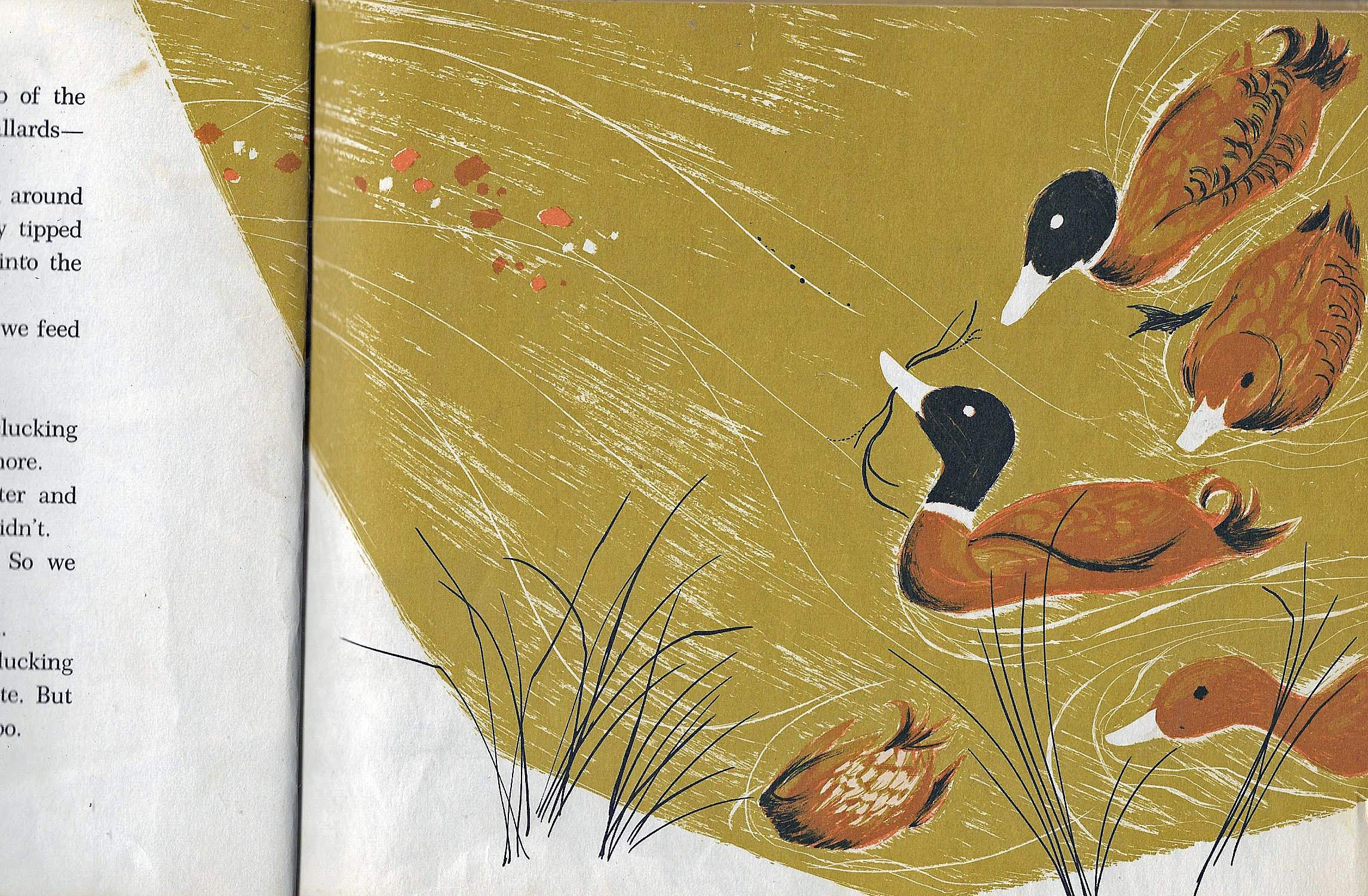 Five mallard ducks frequent a pond in spring, disappear for several weeks, and then a female duck returns to raise eight ducklings.