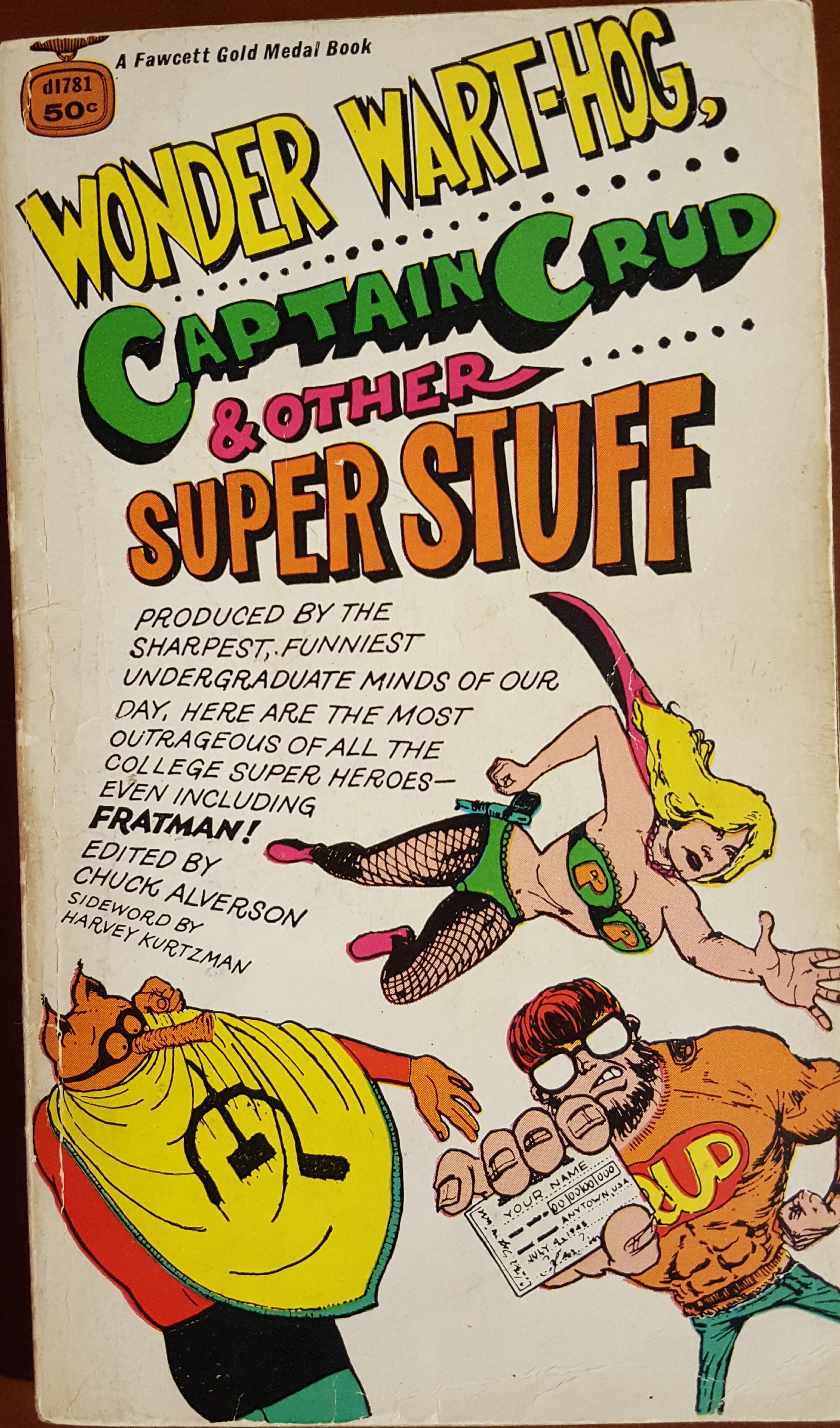 Produced by the sharpest, funniest undergraduate minds of our day, here are the most outrageous of all the college super heroes! Just think, in one little book smaller than a breadbox, is the most slashing (RRRip), searing (WOW) satire ever conceived by the masters of pop, op, camp and pure sheer POW. These raucous pages are the hilarious battleground where the Pepsi generation takes on the Great Society,, where stuffed shirts are torn to shreds by razor minds, where high muckymucks are melted right down to their own clay feet, and where every ludicrous national hero--regardless of race, creed, or color--gets equal opportunity to be boiled in a cauldron of acid wit. B&W collection of reprints of college humor magazine comic stories, exclusively super hero parodies.